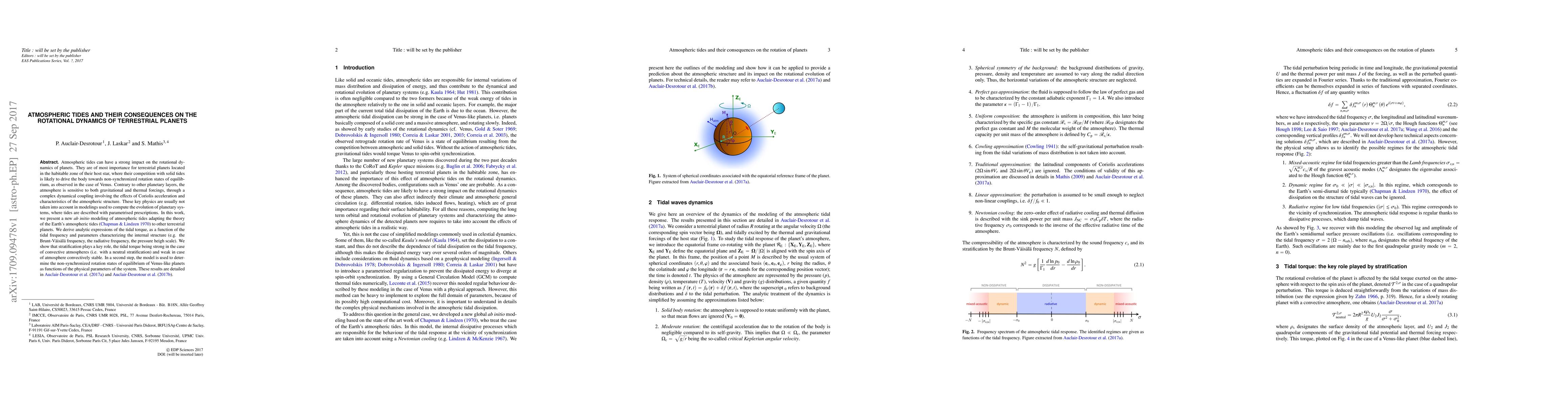 Atmospheric tides can have a strong impact on the rotational dynamics of planets. They are of most importance for terrestrial planets located in the habitable zone of their host star, where their competition with solid tides is likely to drive the body towards non-synchronized rotation states of equilibrium, as observed in the case of Venus. Contrary to other planetary layers, the atmosphere is sensitive to both gravitational and thermal forcings, through a complex dynamical coupling involving the effects of Coriolis acceleration and characteristics of the atmospheric structure. These key physics are usually not taken into account in modelings used to compute the evolution of planetary systems, where tides are described with parametrised prescriptions. In this work, we present a new ab initio modeling of atmospheric tides adapting the theory of the Earth's atmospheric tides (Chapman & Lindzen 1970) to other terrestrial planets. We derive analytic expressions of the tidal torque, as a function of the tidal frequency and parameters characterizing the internal structure (e.g. the Brunt-V\"ais\"al\"a frequency, the radiative frequency, the pressure heigh scale). We show that stratification plays a key role, the tidal torque being strong in the case of convective atmospheres (i.e. with a neutral stratification) and weak in case of atmosphere convectively stable. In a second step, the model is used to determine the non-synchronized rotation states of equilibrium of Venus-like planets as functions of the physical parameters of the system. These results are detailed in Auclair-Desrotour et al. (2017a) and Auclair-Desrotour et al. (2017b).