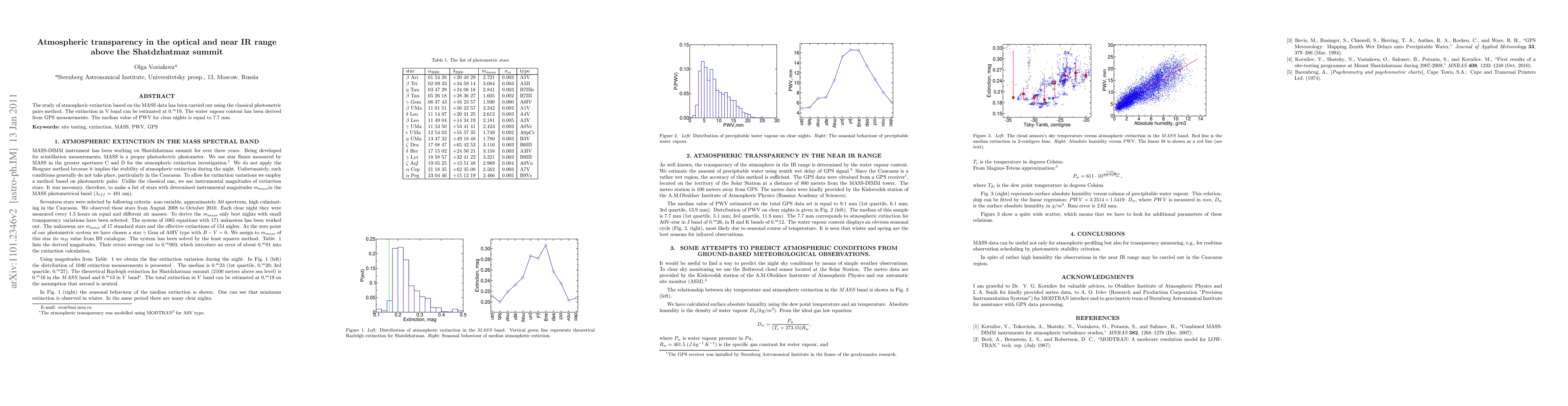 The study of atmospheric extinction based on the MASS data has been carried out using the classical photometric pairs method. The extinction in V band can be estimated at 0.m 19. The water vapour content has been derived from GPS measurements. The median value of PWV for clear nights is equal to 7.7 mm.