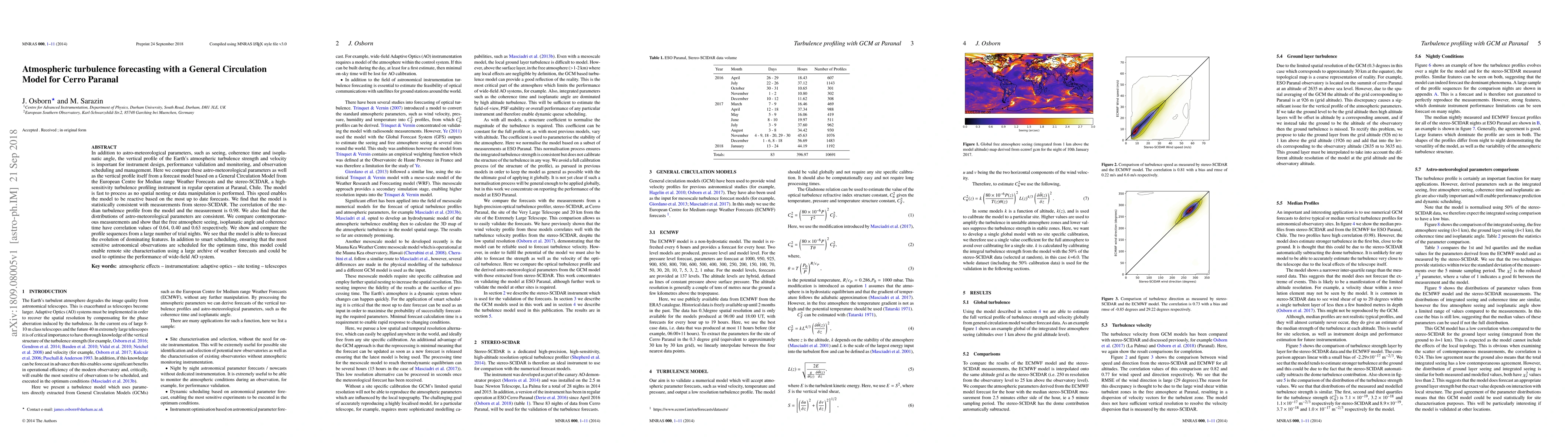This paper evaluates a General Circulation Model for forecasting atmospheric turbulence at Cerro Paranal, comparing its predictions with measurements from a stereo-SCIDAR instrument. The model shows high statistical consistency with measurements, with a correlation of 0.98 for the median turbulence profile, and could optimize astronomical observation scheduling and remote site characterization.