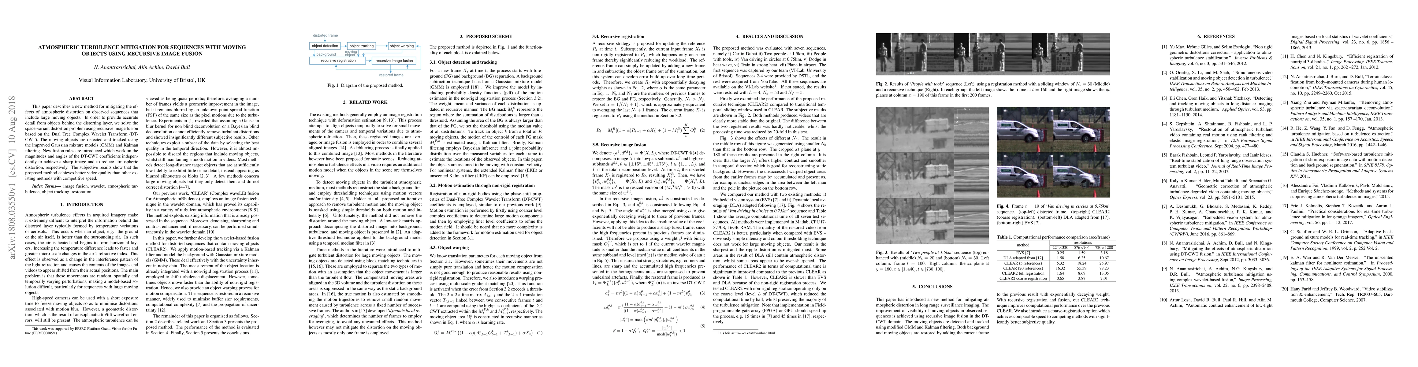 This paper describes a new method for mitigating the effects of atmospheric distortion on observed sequences that include large moving objects. In order to provide accurate detail from objects behind the distorting layer, we solve the space-variant distortion problem using recursive image fusion based on the Dual Tree Complex Wavelet Transform (DT-CWT). The moving objects are detected and tracked using the improved Gaussian mixture models (GMM) and Kalman filtering. New fusion rules are introduced which work on the magnitudes and angles of the DT-CWT coefficients independently to achieve a sharp image and to reduce atmospheric distortion, respectively. The subjective results show that the proposed method achieves better video quality than other existing methods with competitive speed.