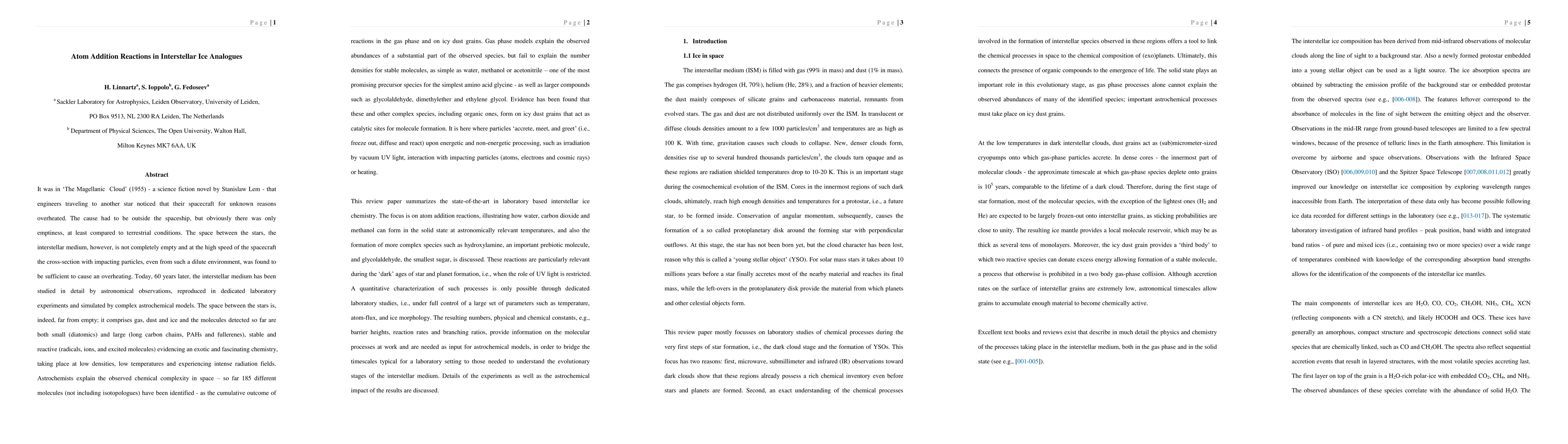 This paper reviews laboratory studies on atom addition reactions in interstellar ice analogues, highlighting the formation of water, carbon dioxide, methanol, and complex prebiotic molecules like hydroxylamine and glycolaldehyde at low temperatures, crucial for understanding star and planet formation processes. The study provides essential data for astrochemical models.
