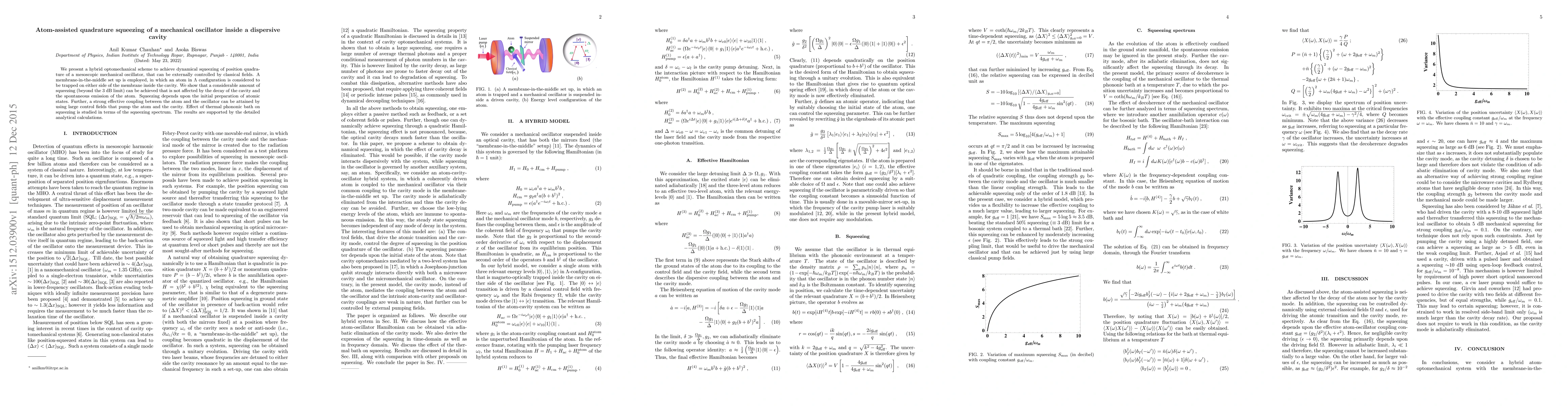 This paper proposes a hybrid optomechanical system using a membrane-in-the-middle setup with an atom to achieve significant squeezing of a mechanical oscillator's position quadrature, surpassing the 3 dB limit, and demonstrates robustness against decay and spontaneous emission. Analytical calculations support the findings and show the dependence of squeezing on atomic state preparation and effective coupling via control fields.