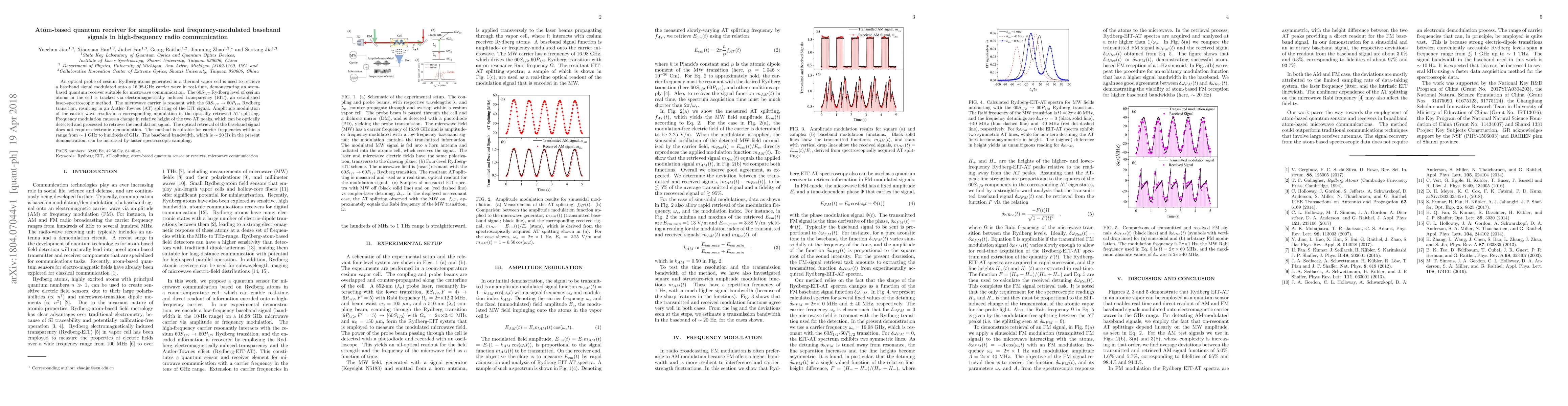 This paper presents an atom-based quantum receiver using cesium Rydberg atoms in a thermal vapor cell to retrieve amplitude- and frequency-modulated baseband signals from a 16.98-GHz carrier wave in real-time, employing electromagnetically induced transparency and Autler-Townes splitting for signal detection without electronic demodulation.