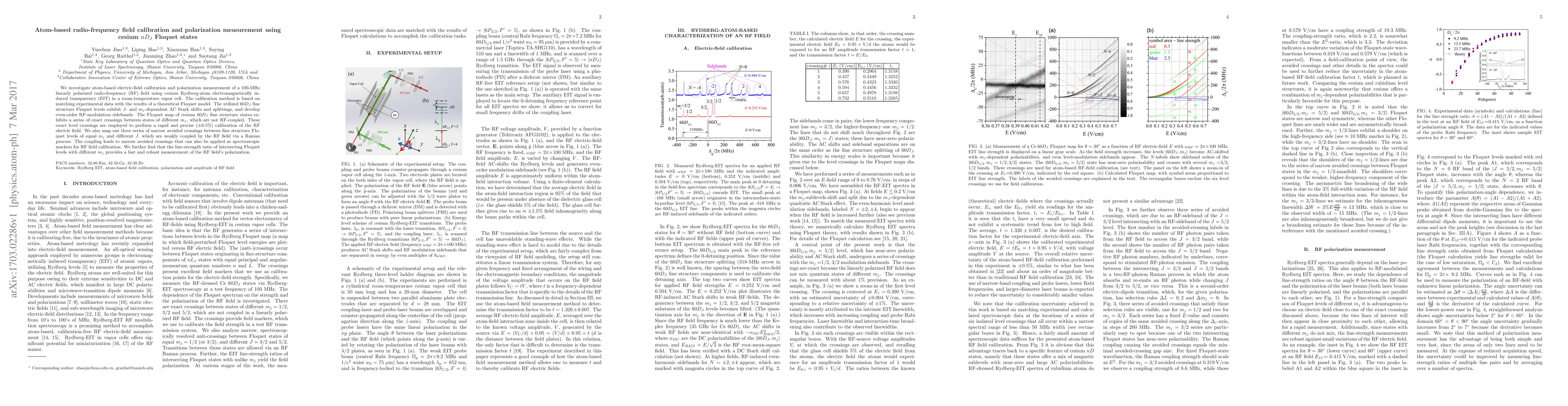 We investigate atom-based electric-field calibration and polarization measurement of a 100-MHz linearly polarized radio-frequency (RF) field using cesium Rydberg-atom electromagnetically induced transparency (EIT) in a room-temperature vapor cell. The calibration method is based on matching experimental data with the results of a theoretical Floquet model. The utilized 60$D_J$ fine structure Floquet levels exhibit $J$- and $m_j$-dependent AC Stark shifts and splittings, and develop even-order RF-modulation sidebands. The Floquet map of cesium 60$D_J$ fine structure states exhibits a series of exact crossings between states of different $m_j$, which are not RF-coupled. These exact level crossings are employed to perform a rapid and precise ($\pm 0.5\%$) calibration of the RF electric field. We also map out three series of narrow avoided crossings between fine structure Floquet levels of equal $m_j$ and different $J$, which are weakly coupled by the RF field via a Raman process. The coupling leads to narrow avoided crossings that can also be applied as spectroscopic markers for RF field calibration. We further find that the line-strength ratio of intersecting Floquet levels with different $m_j$ provides a fast and robust measurement of the RF field's polarization.