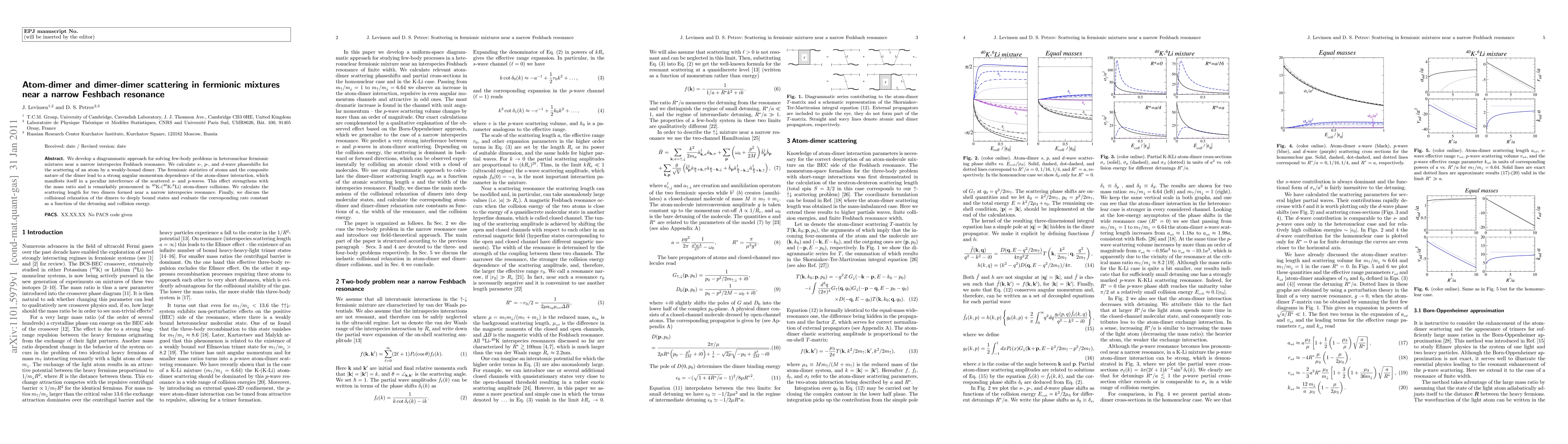 This paper develops a diagrammatic method to analyze scattering in fermionic mixtures near a narrow Feshbach resonance, revealing strong angular momentum dependence in atom-dimer interactions and significant interference effects, particularly in 40K-(40K-6Li) collisions. It also evaluates the scattering length for dimer-dimer interactions and discusses the relaxation rate of dimers to bound states.