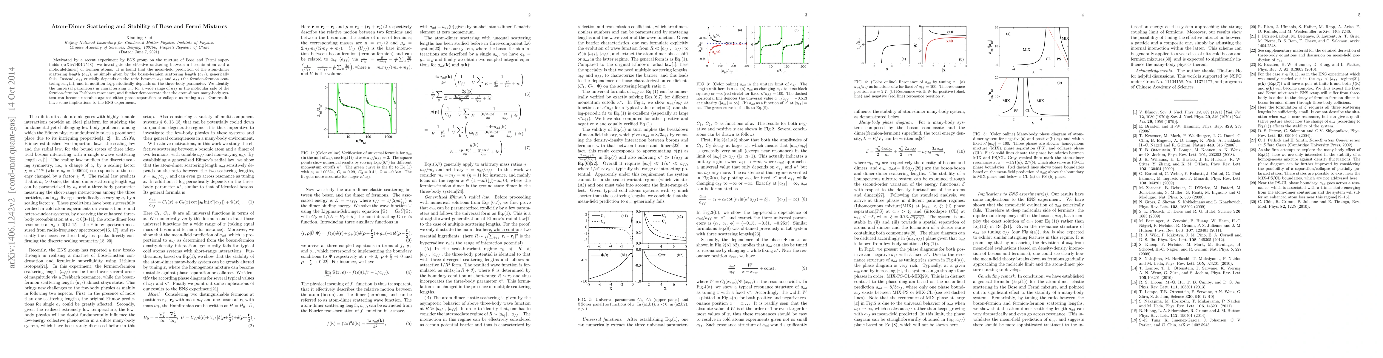 Motivated by a recent experiment by ENS group on the mixture of Bose and Fermi superfluids (arxiv:1404.2548), we investigate the effective scattering between a bosonic atom and a molecule(dimer) of fermion atoms. It is found that the mean-field prediction of the atom-dimer scattering length ($a_{ad}$), as simply given by the boson-fermion scattering length ($a_{bf}$), generically fails. Instead, $a_{ad}$ crucially depends on the ratio between $a_{bf}$ and $a_{ff}$ (the fermion-fermion scattering length), and in addition log-periodically depends on the three-body parameter. We identify the universal parameters in characterizing $a_{ad}$ for a wide range of $a_{ff}$ in the molecular side of the fermion-fermion Feshbach resonance, and further demonstrate that the atom-dimer many-body system can become unstable against either phase separation or collapse as tuning $a_{ff}$. Our results have some implications to the ENS experiment.