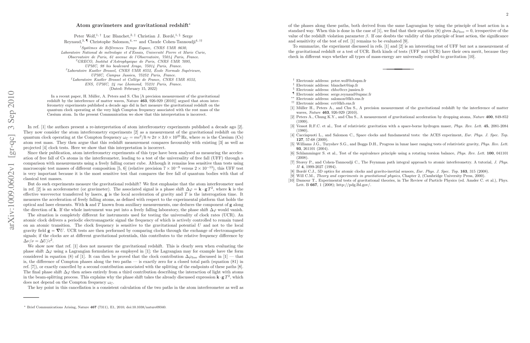 In a recent paper, H. Mueller, A. Peters and S. Chu [A precision measurement of the gravitational redshift by the interference of matter waves, Nature 463, 926-929 (2010)] argued that atom interferometry experiments published a decade ago did in fact measure the gravitational redshift on the quantum clock operating at the very high Compton frequency associated with the rest mass of the Caesium atom. In the present Communication we show that this interpretation is incorrect.