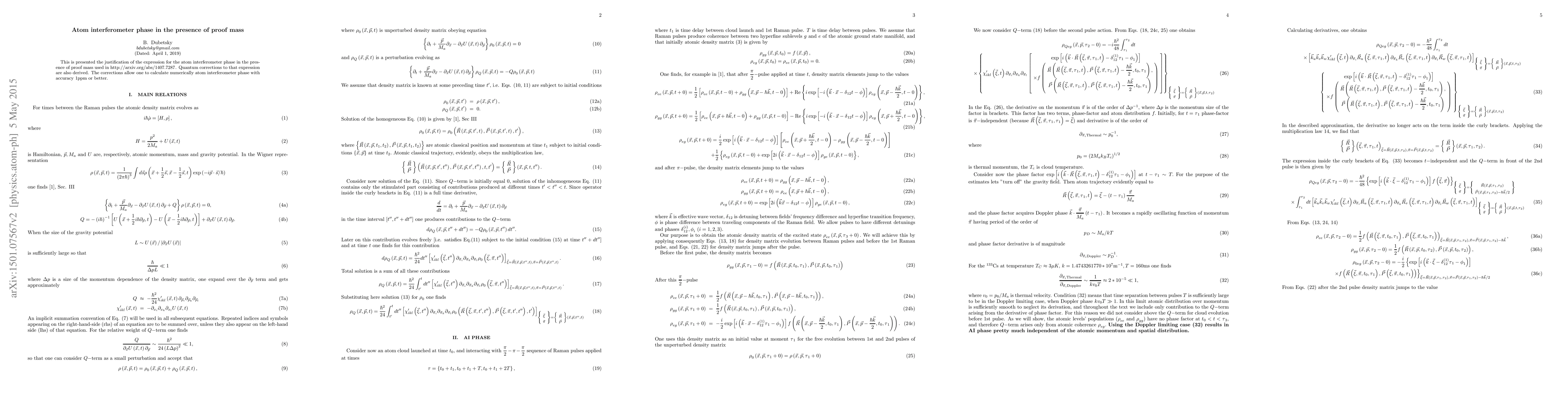 This is presented the justification of the expression for the atom interferometer phase in the presence of proof mass used in arXiv:1407.7287. Quantum corrections to that expression are also derived. The corrections allow one to calculate numerically atom interferometer phase with accuracy 1ppm or better.