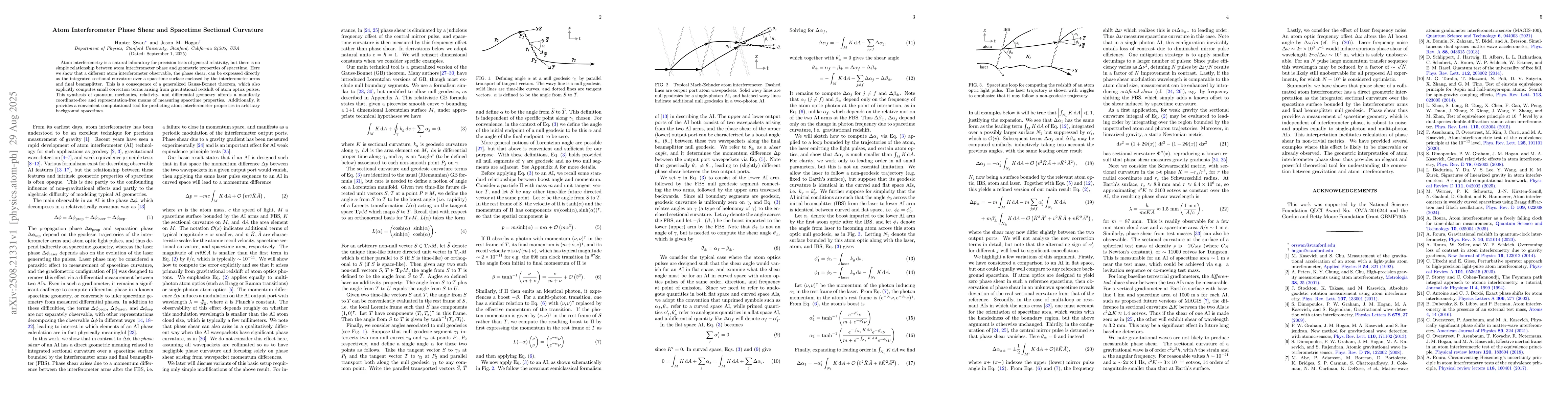 Atom interferometry is a natural laboratory for precision tests of general relativity, but there is no simple relationship between atom interferometer phase and geometric properties of spacetime. Here we show that a different atom interferometer observable, the phase shear, can be expressed directly as the integrated sectional curvature over a spacetime surface enclosed by the interferometer arms and final beamsplitter. This is a consequence of a generalized Gauss-Bonnet theorem, which also explicitly computes small correction terms arising from gravitational redshift of atom optics pulses. This synthesis of quantum mechanics, relativity, and differential geometry affords a manifestly coordinate-free and representation-free means of measuring spacetime properties. Additionally, it provides a convenient computational tool for predicting atom interferometer properties in arbitrary background spacetimes.
