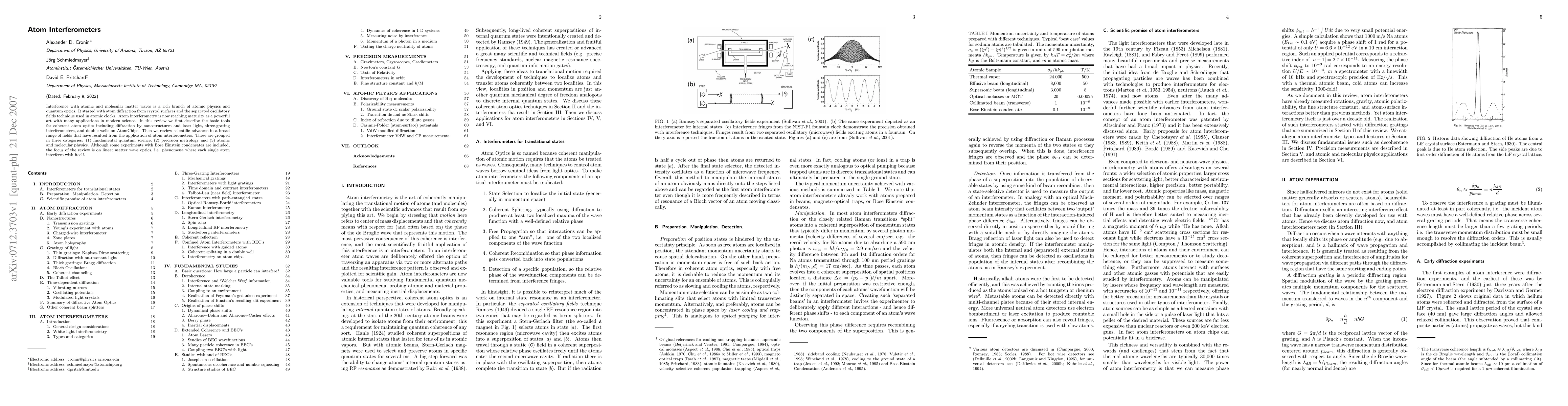 This paper reviews the development and applications of atom interferometers, highlighting their role in coherent atom optics and their impact on fundamental quantum science, precision metrology, and atomic/molecular physics. It emphasizes linear matter wave optics and the use of techniques like diffraction and laser light.