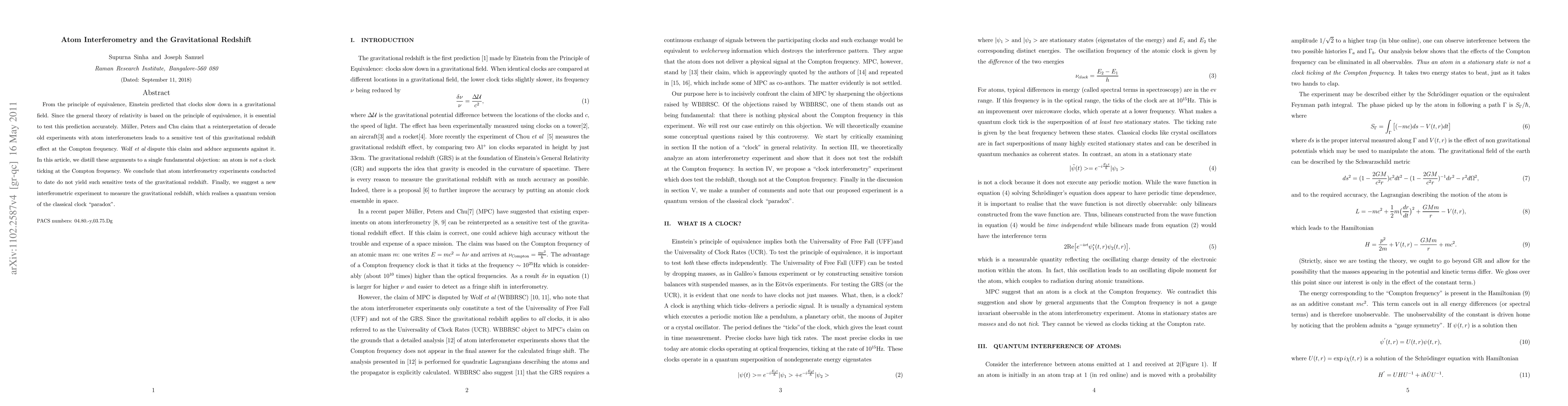 From the principle of equivalence, Einstein predicted that clocks slow down in a gravitational field. Since the general theory of relativity is based on the principle of equivalence, it is essential to test this prediction accurately. Muller, Peters and Chu claim that a reinterpretation of decade old experiments with atom interferometers leads to a sensitive test of this gravitational redshift effect at the Compton frequency. Wolf et al dispute this claim and adduce arguments against it. In this article, we distill these arguments to a single fundamental objection: an atom is NOT a clock ticking at the Compton frequency. We conclude that atom interferometry experiments conducted to date do not yield such sensitive tests of the gravitational redshift. Finally, we suggest a new interferometric experiment to measure the gravitational redshift, which realises a quantum version of the classical clock "paradox".