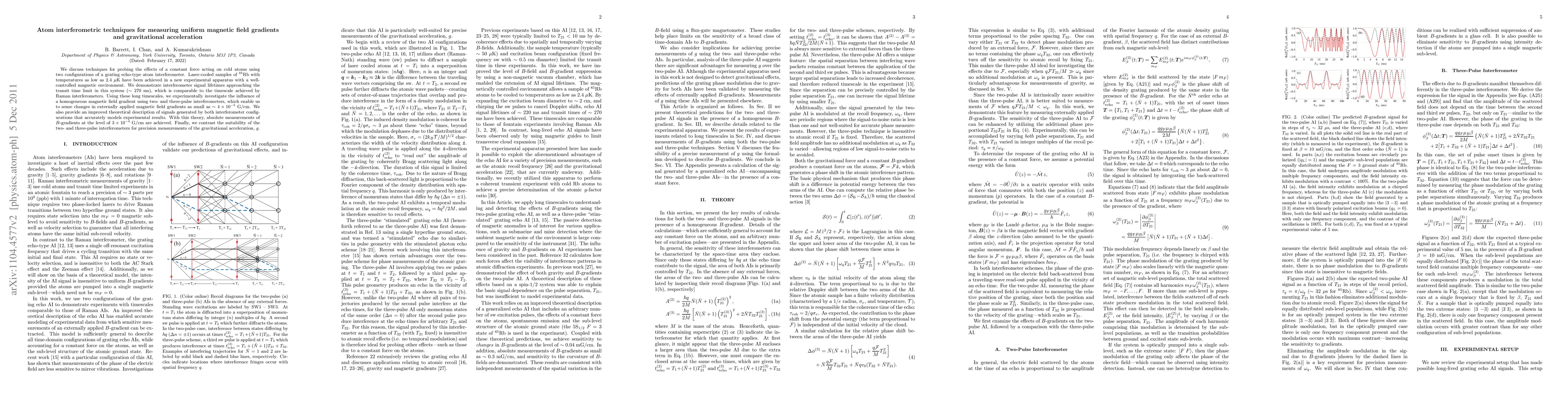 This paper explores atom interferometric techniques for measuring uniform magnetic field gradients and gravitational acceleration using laser-cooled $^{85}$Rb atoms. It demonstrates high-precision measurements of magnetic field gradients and compares the efficacy of two- and three-pulse interferometers for gravitational acceleration measurements.