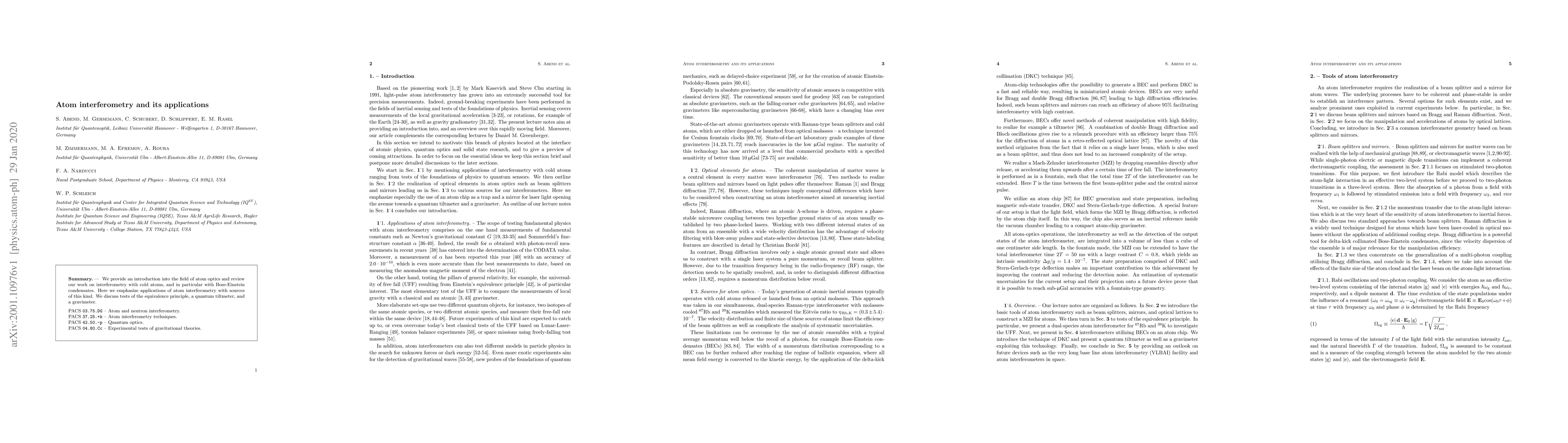 Summary: This paper introduces atom optics and reviews research on interferometry with cold atoms, focusing on Bose-Einstein condensates. It highlights applications including tests of the equivalence principle, a quantum tiltmeter, and a gravimeter.