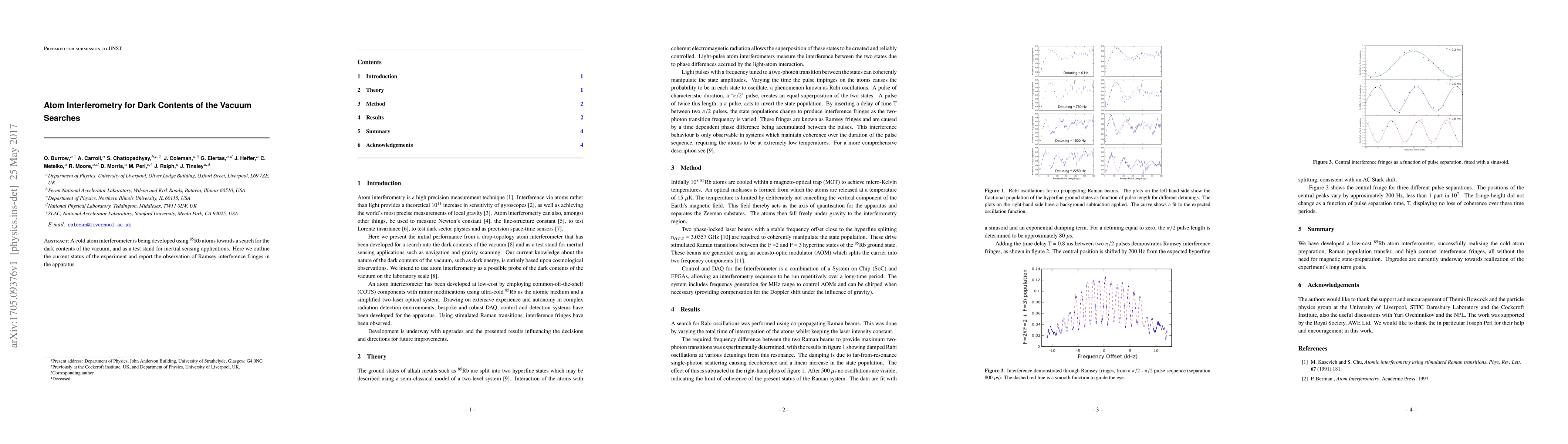 This paper details the development of a cold atom interferometer using 85Rb atoms for exploring dark contents of the vacuum, reporting the successful observation of Ramsey interference fringes, and its potential for inertial sensing applications.