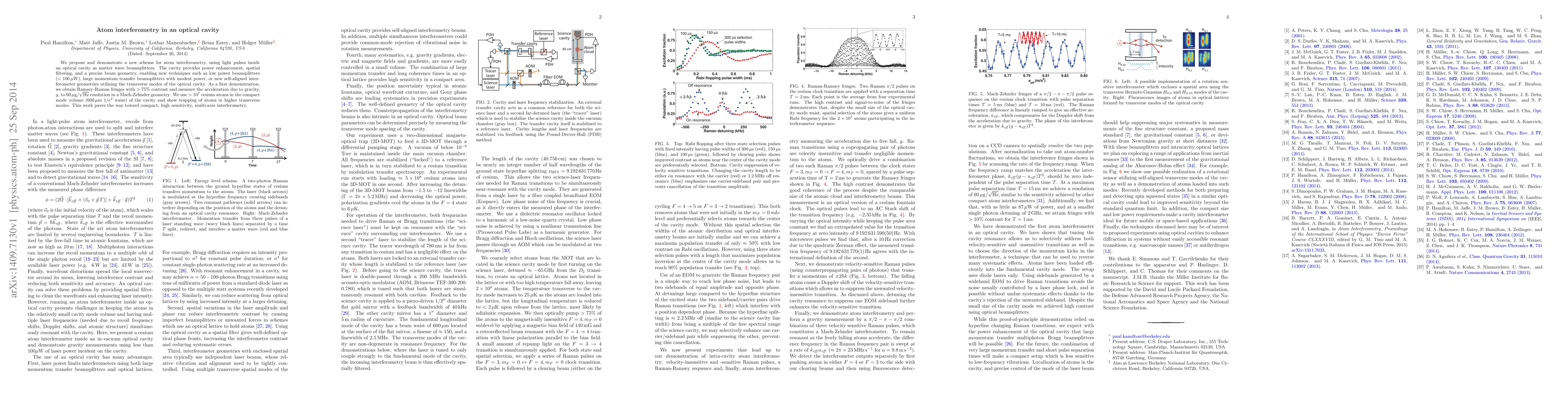 This paper proposes a novel atom interferometry scheme utilizing light pulses within an optical cavity as beamsplitters, achieving enhanced power, spatial filtering, and precise geometry. The demonstrated method enables low-power, large-momentum transfer beamsplitters and self-aligned interferometer geometries, achieving high-resolution measurements of gravitational acceleration.