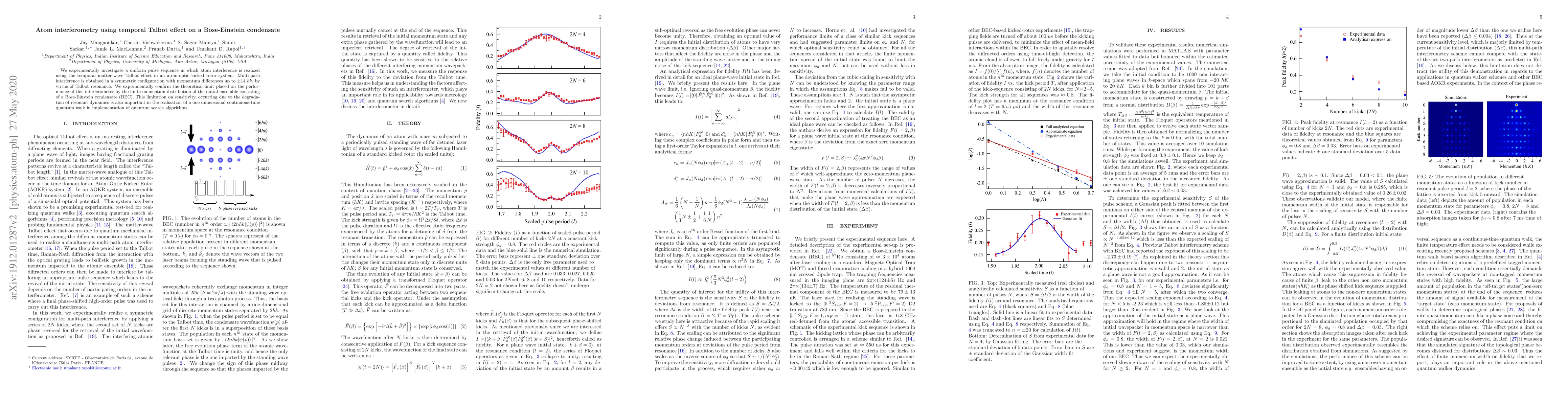 This paper investigates atom interferometry using the temporal Talbot effect on a Bose-Einstein condensate, achieving multi-path interference in an asymmetric configuration. The study confirms the theoretical limits on interferometer performance due to the finite momentum distribution of the initial BEC ensemble, relevant for quantum search algorithms.