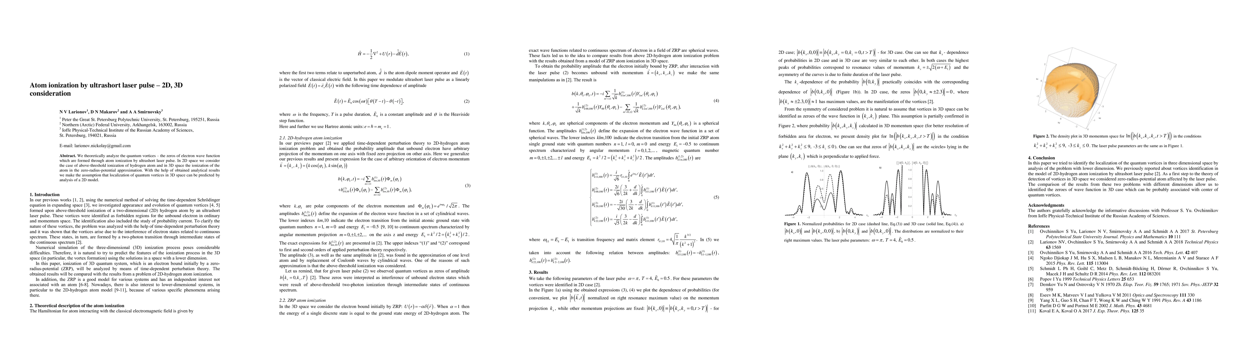 We theoretically analyze the quantum vortices - the zeros of electron wave function which are formed through atom ionization by ultrashort laser pulse. In 2D space we consider the case of above-threshold ionization of hydrogen atom and in 3D space the ionization of the atom in the zero-radius-potential approximation. With the help of obtained analytical results we make the assumption that localization of quantum vortices in 3D space can be predicted by analysis of 2D model.