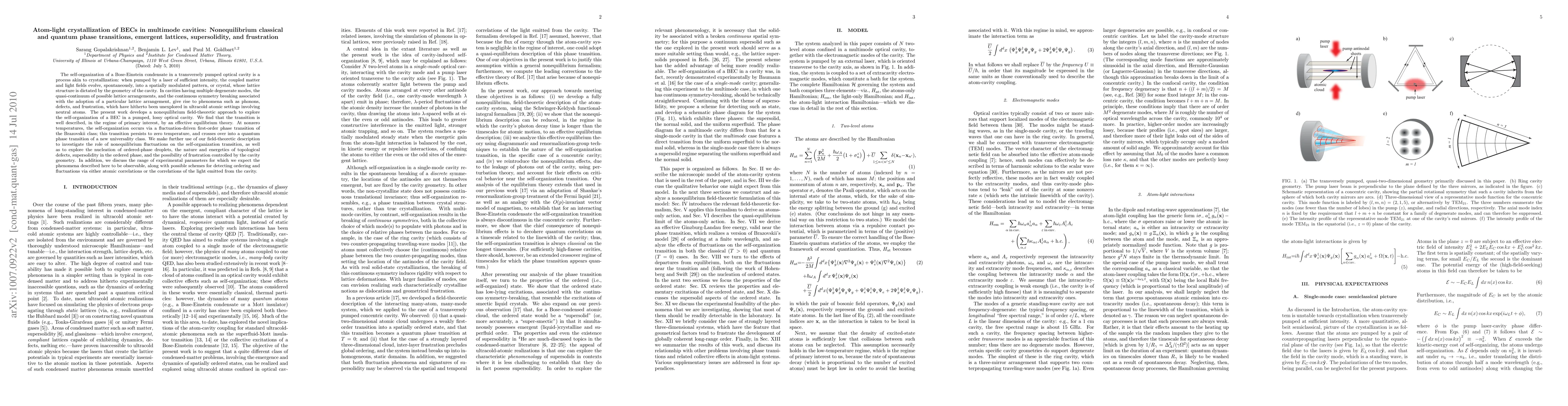 The self-organization of a Bose-Einstein condensate in a transversely pumped optical cavity is a process akin to crystallization: when pumped by a laser of sufficient intensity, the coupled matter and light fields evolve, spontaneously, into a spatially modulated pattern, or crystal, whose lattice structure is dictated by the geometry of the cavity. In cavities having multiple degenerate modes, the quasi-continuum of possible lattice arrangements, and the continuous symmetry breaking associated with the adoption of a particular lattice arrangement, give rise to phenomena such as phonons, defects, and frustration, which have hitherto been unexplored in ultracold atomic settings involving neutral atoms. The present work develops a nonequilibrium field-theoretic approach to explore the self-organization of a BEC in a pumped, lossy optical cavity. We find that the transition is well described, in the regime of primary interest, by an effective equilibrium theory. At nonzero temperatures, the self-organization occurs via a fluctuation-driven first-order phase transition of the Brazovskii class; this transition persists to zero temperature, and crosses over into a quantum phase transition of a new universality class. We make further use of our field-theoretic description to investigate the role of nonequilibrium fluctuations on the self-organization transition, as well as to explore the nucleation of ordered-phase droplets, the nature and energetics of topological defects, supersolidity in the ordered phase, and the possibility of frustration controlled by the cavity geometry. In addition, we discuss the range of experimental parameters for which we expect the phenomena described here to be observable, along with possible schemes for detecting ordering and fluctuations via either atomic correlations or the correlations of the light emitted from the cavity.