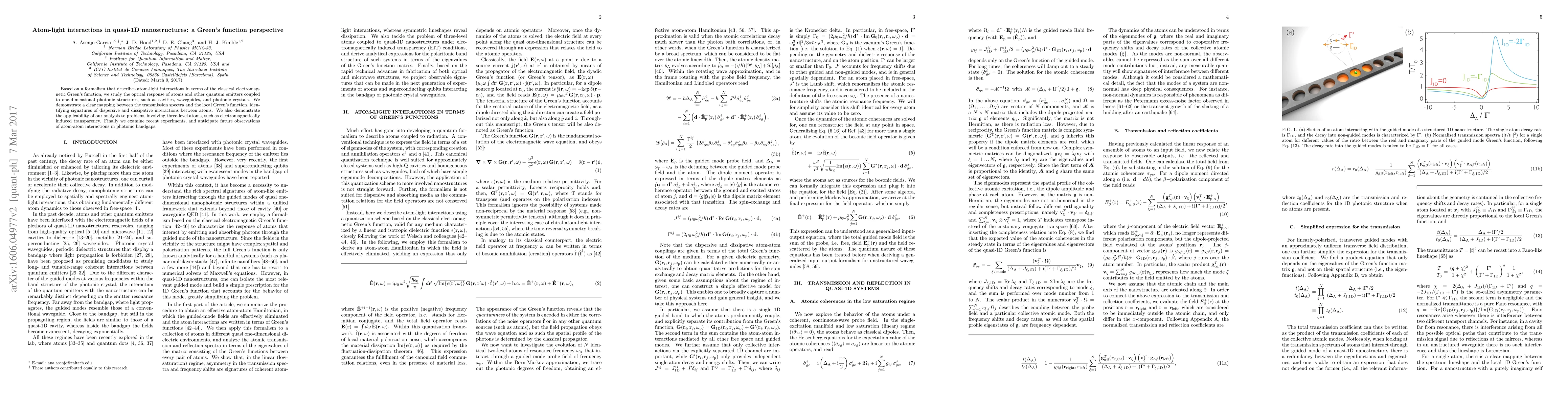 This paper uses the classical electromagnetic Green's function formalism to study atom-light interactions in quasi-1D nanostructures, demonstrating a correlation between transmission spectra and local Green's function for dispersive and dissipative interactions. It also applies the analysis to three-level atoms and discusses future experimental observations of atom-atom interactions in photonic bandgaps.