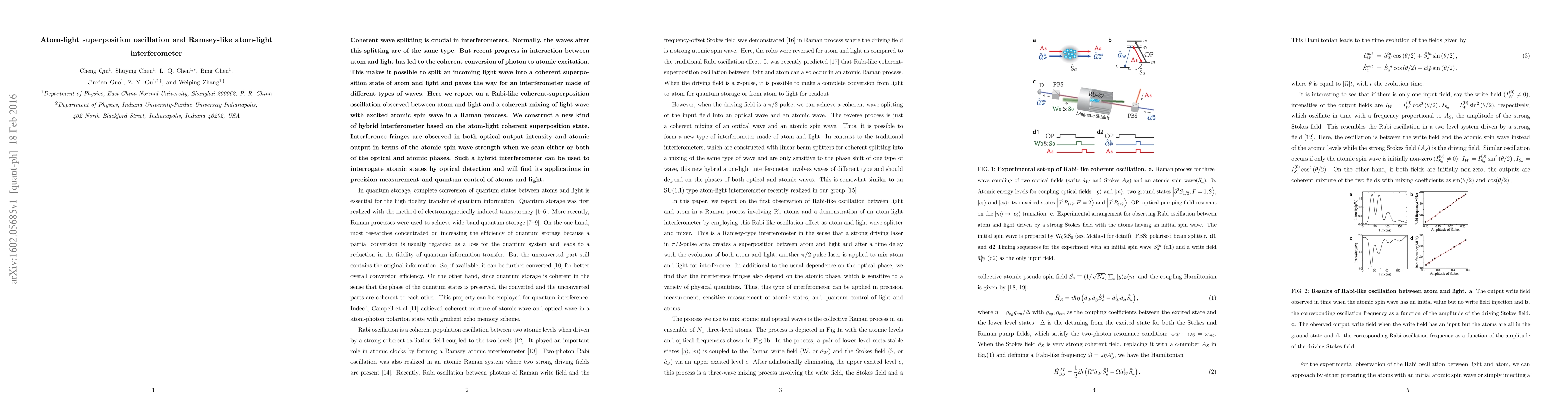 This paper reports on a novel hybrid interferometer utilizing the coherent superposition of atom-light states, observing Rabi-like oscillations and interference fringes in both optical and atomic spin wave outputs, which could advance precision measurement and quantum control applications.