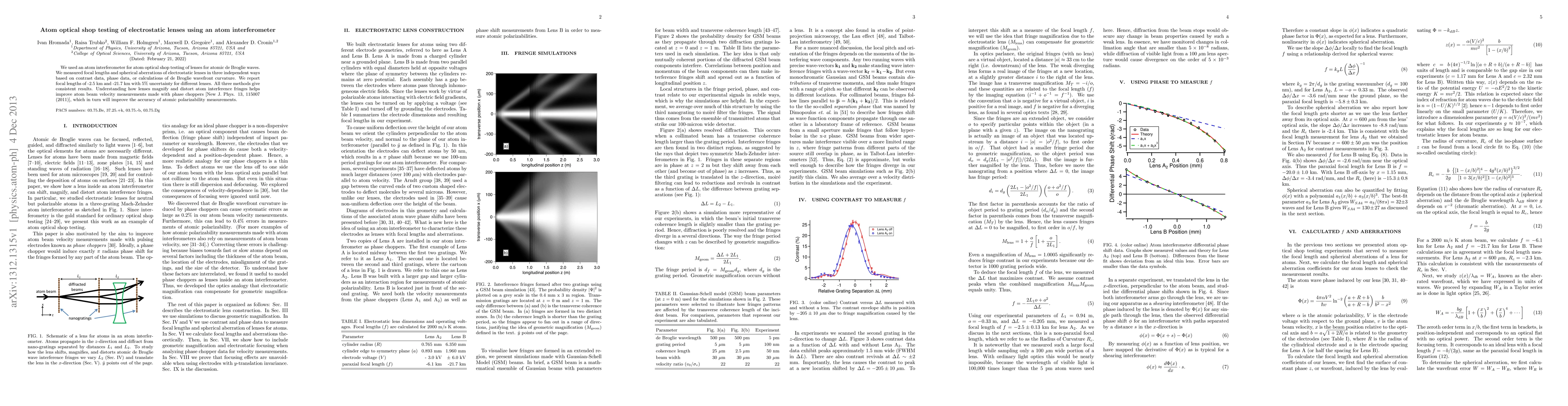 We used an atom interferometer for atom optical shop testing of lenses for atomic de Broglie waves. We measured focal lengths and spherical aberrations of electrostatic lenses in three independent ways based on contrast data, phase data, or calculations of de Broglie wavefront curvature. We report focal lengths of -2.5 km and -21.7 km with 5% uncertainty for different lenses. All three methods give consistent results. Understanding how lenses magnify and distort atom interference fringes helps improve atom beam velocity measurements made with phase choppers [New J. Phys. 13, 115007 (2011)], which in turn will improve the accuracy of atomic polarizability measurements.
