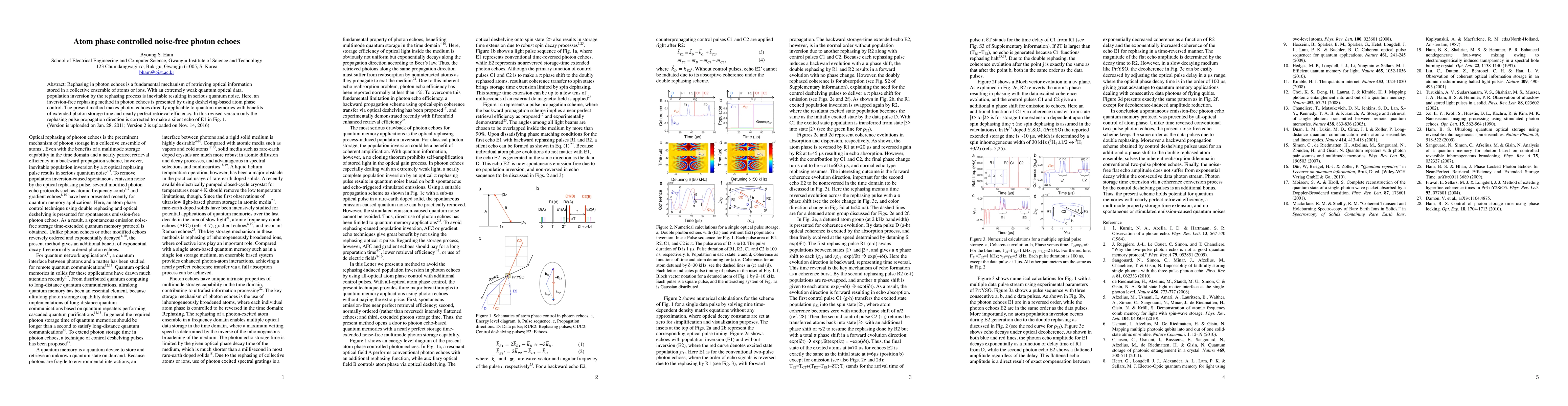 This paper presents an inversion-free rephasing method in photon echoes using deshelving-based atom phase control to eliminate quantum noise, enhancing photon storage time and retrieval efficiency for quantum memories. The revised version corrects the rephasing pulse propagation direction for a noise-free photon echo.
