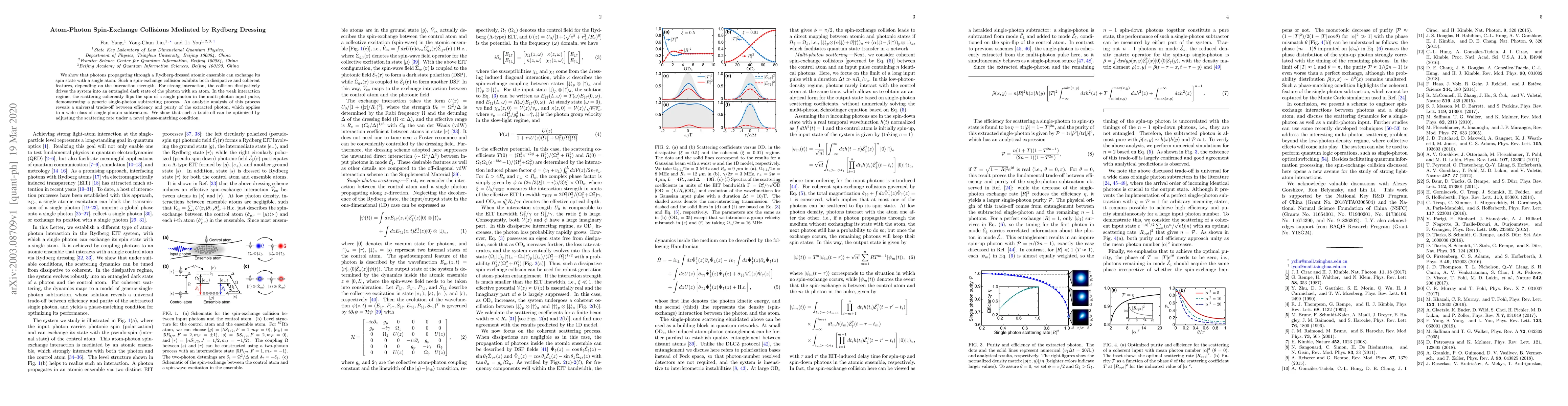We show that photons propagating through a Rydberg-dressed atomic ensemble can exchange its spin state with a single atom. Such a spin-exchange collision exhibits both dissipative and coherent features, depending on the interaction strength. For strong interaction, the collision dissipatively drives the system into an entangled dark state of the photon with an atom. In the weak interaction regime, the scattering coherently flips the spin of a single photon in the multi-photon input pulse, demonstrating a generic single-photon subtracting process. An analytic analysis of this process reveals a universal trade-off between efficiency and purity of the extracted photon, which applies to a wide class of single-photon subtractors. We show that such a trade-off can be optimized by adjusting the scattering rate under a novel phase-matching condition.