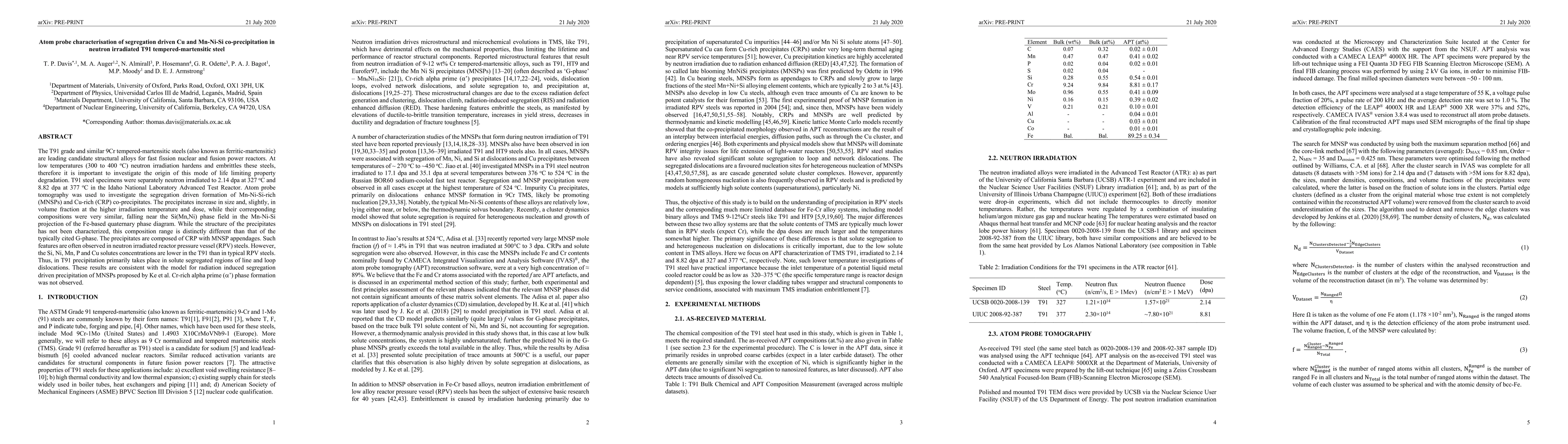 This study investigates the formation of Mn-Ni-Si-rich and Cu-rich co-precipitates in neutron irradiated T91 steel using atom probe tomography, revealing that these precipitates form in segregated regions of dislocations and do not follow the typical G-phase composition, contributing to embrittlement at low temperatures.
