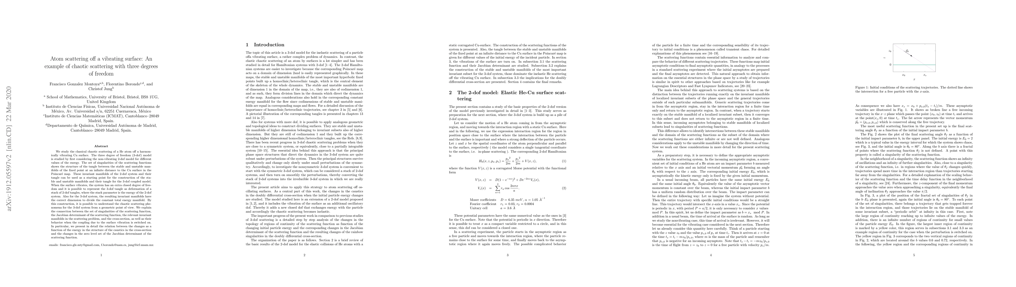 This paper investigates the chaotic scattering of a He atom off a vibrating Cu surface using a three-degree-of-freedom model. It explores the geometric structures, including stable and unstable manifolds, that explain the chaotic scattering phenomena, and links these structures to the scattering function's singularities and the Jacobian determinant's zero level set.