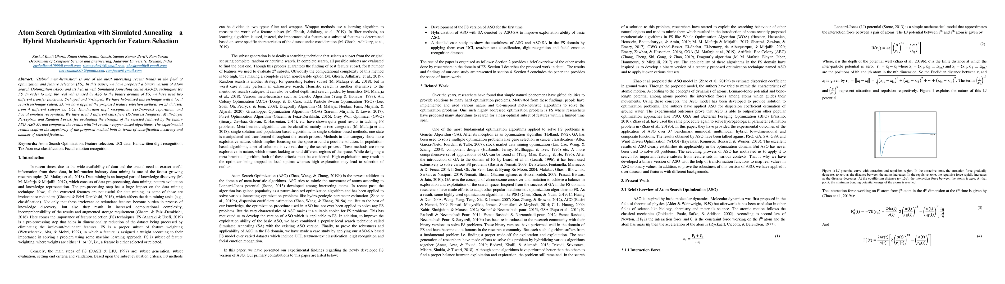 'Hybrid meta-heuristics' is one of the most interesting recent trends in the field of optimization and feature selection (FS). In this paper, we have proposed a binary variant of Atom Search Optimization (ASO) and its hybrid with Simulated Annealing called ASO-SA techniques for FS. In order to map the real values used by ASO to the binary domain of FS, we have used two different transfer functions: S-shaped and V-shaped. We have hybridized this technique with a local search technique called, SA We have applied the proposed feature selection methods on 25 datasets from 4 different categories: UCI, Handwritten digit recognition, Text, non-text separation, and Facial emotion recognition. We have used 3 different classifiers (K-Nearest Neighbor, Multi-Layer Perceptron and Random Forest) for evaluating the strength of the selected featured by the binary ASO, ASO-SA and compared the results with some recent wrapper-based algorithms. The experimental results confirm the superiority of the proposed method both in terms of classification accuracy and number of selected features.