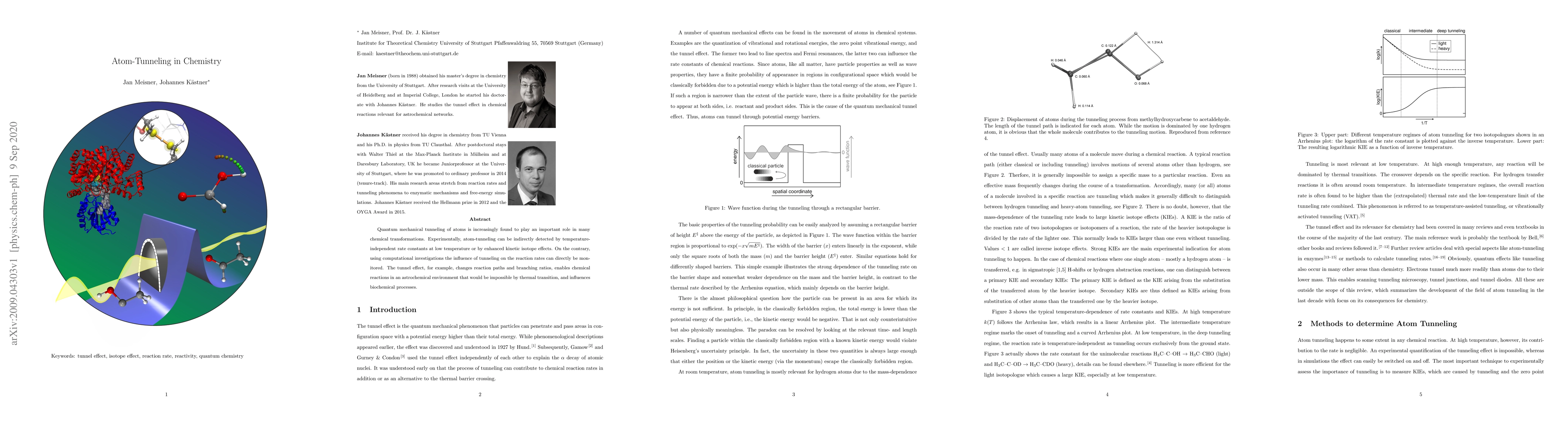 Quantum mechanical tunneling of atoms is increasingly found to play an important role in many chemical transformations. Experimentally, atom-tunneling can be indirectly detected by temperature-independent rate constants at low temperature or by enhanced kinetic isotope effects. On the contrary, using computational investigations the influence of tunneling on the reaction rates can directly be monitored. The tunnel effect, for example, changes reaction paths and branching ratios, enables chemical reactions in an astrochemical environment that would be impossible by thermal transition, and influences biochemical processes.