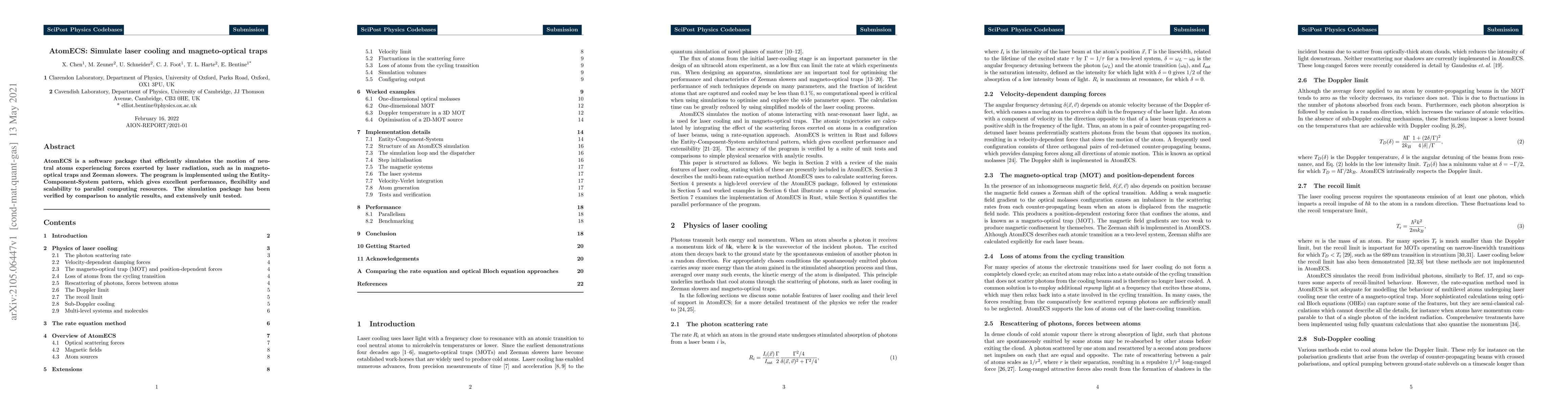 AtomECS is a software package that simulates the motion of neutral atoms under laser radiation forces, specifically in magneto-optical traps (MOTs) and Zeeman slowers. It uses the Entity-Component-System (ECS) pattern for performance, flexibility, and scalability, verified through analytic comparisons and extensive unit testing.