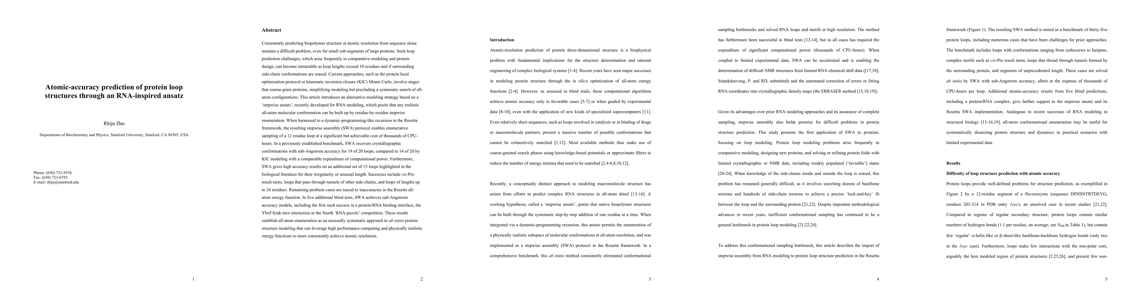 This paper introduces an RNA-inspired stepwise ansatz for predicting protein loop structures with atomic accuracy, achieving sub-Angstrom precision for most tested loops, including irregular and unusually long ones. The method, implemented within the Rosetta framework, demonstrates significant improvements over existing techniques in both benchmark and blind tests.