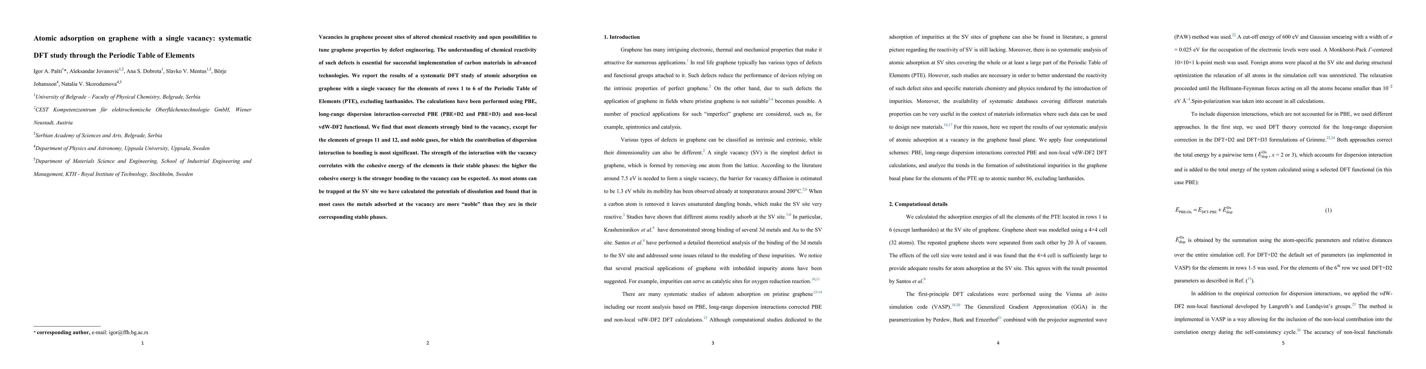 This paper systematically investigates the adsorption of elements from rows 1 to 6 of the Periodic Table on graphene with a single vacancy using DFT calculations, revealing strong binding for most elements except for groups 11 and 12, and noble gases, where dispersion interactions dominate. The binding strength correlates with the cohesive energy of the elements, and metals adsorbed at the vacancy exhibit increased "nobility."