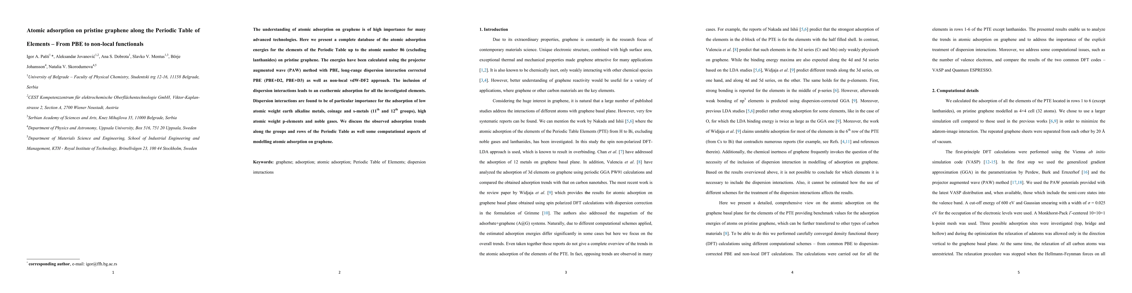 This paper compiles atomic adsorption energies for elements up to atomic number 86 on graphene, calculated using various functionals, highlighting the significance of dispersion interactions, especially for certain groups in the Periodic Table. The study underscores the exothermic nature of adsorption when dispersion corrections are included.