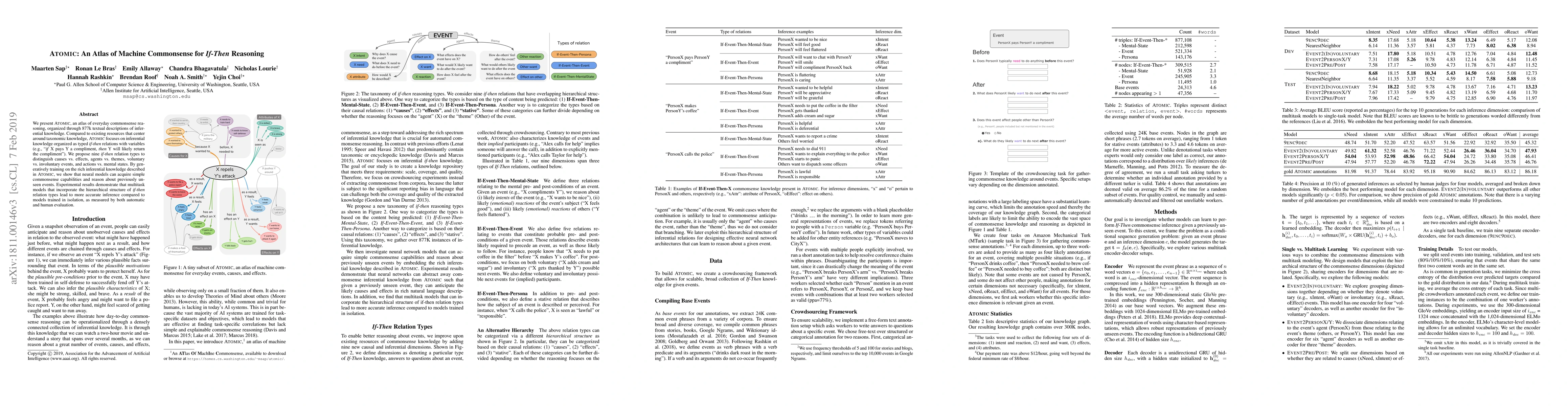 ATOMIC is an atlas of machine commonsense focusing on inferential knowledge through 877k if-then relations, enabling neural models to reason about new events. Multitask models leveraging ATOMIC's hierarchical structure outperform isolated models in inferential accuracy, as shown by both automatic and human evaluations.