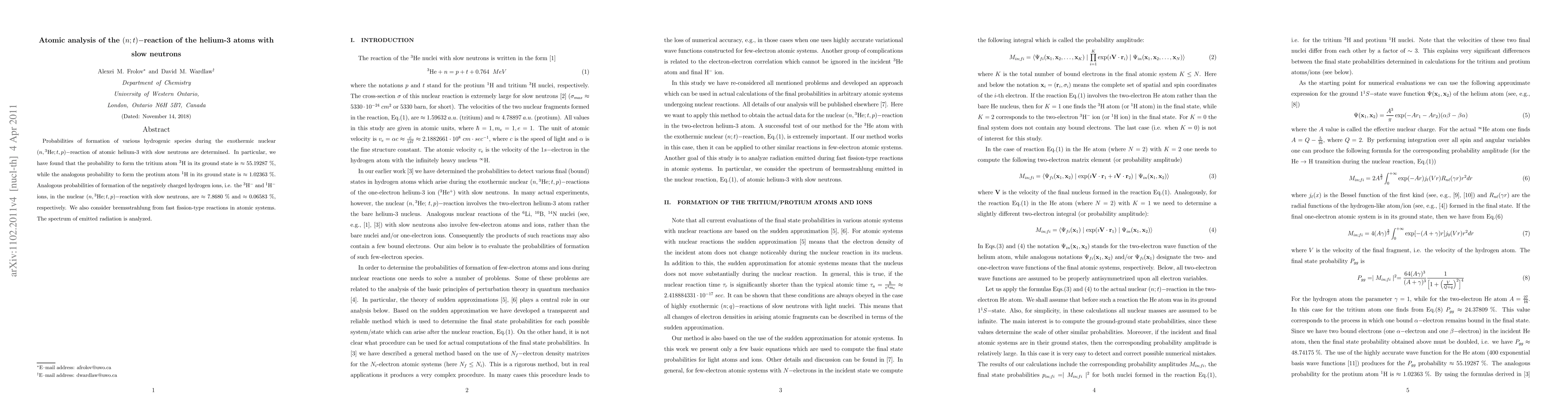 Probabilties of formation of various hydrogenic species during the exothermic nuclear $(n,{}^3$He$;t,p)-$reaction of atomic helium-3 with slow neutrons are determined. In particular, we have found that the probability to form the tritium atom ${}^3$H in its ground state is $\approx$ 55.19287 %, while analogous probability to form the protium atom ${}^1$H is $\approx$ 1.02363 %. Analogous probabilities of formation of the negatively charged hydrogen ions, i.e. the ${}^3$H$^{-}$ and ${}^1$H$^{-}$ ions, in the nuclear $(n,{}^3$He$; t,p)-$reaction with slow neutrons, are $\approx$ 7.8680 % and $\approx$ 0.06583 %, respectively. We also consider bremsstrahlung from fast fission-type reactions in atomic systems. The spectrum of emitted radiation is analyzed.