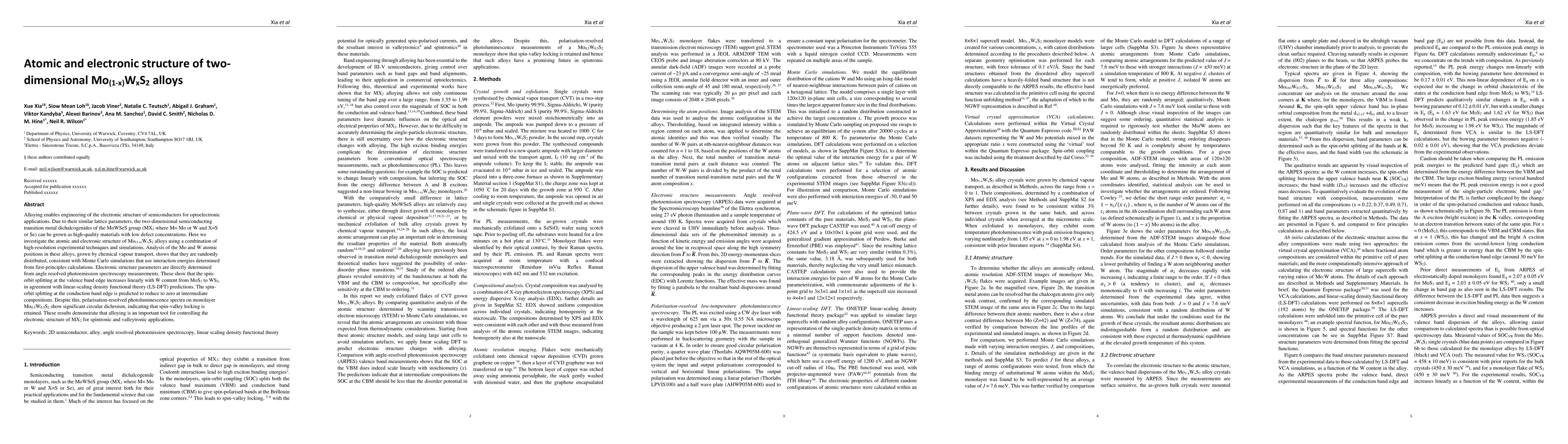 This paper investigates the atomic and electronic structure of Mo(1-x)WxS2 alloys, revealing that Mo and W atoms are randomly distributed. The study shows that spin-orbit splitting increases linearly with W content, while spin-valley locking is retained, highlighting alloying's potential for optoelectronic applications.