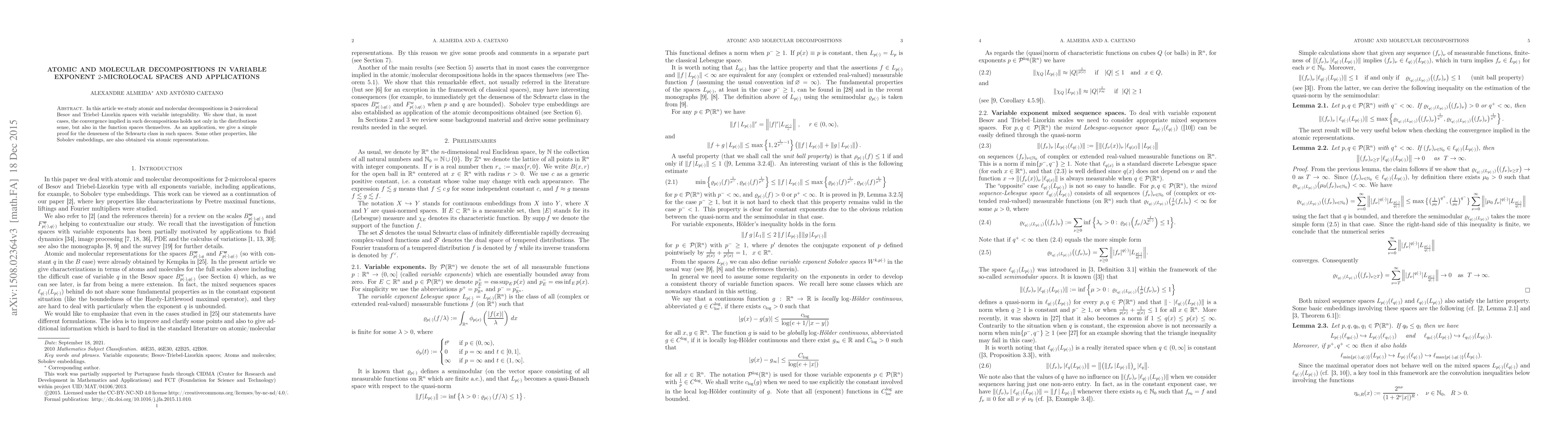 In this article we study atomic and molecular decompositions in $2$-microlocal Besov and Triebel--Lizorkin spaces with variable integrability. We show that, in most cases, the convergence implied in such decompositions holds not only in the distributions sense, but also in the function spaces themselves. As an application, we give a simple proof for the denseness of the Schwartz class in such spaces. Some other properties, like Sobolev embeddings, are also obtained via atomic representations.