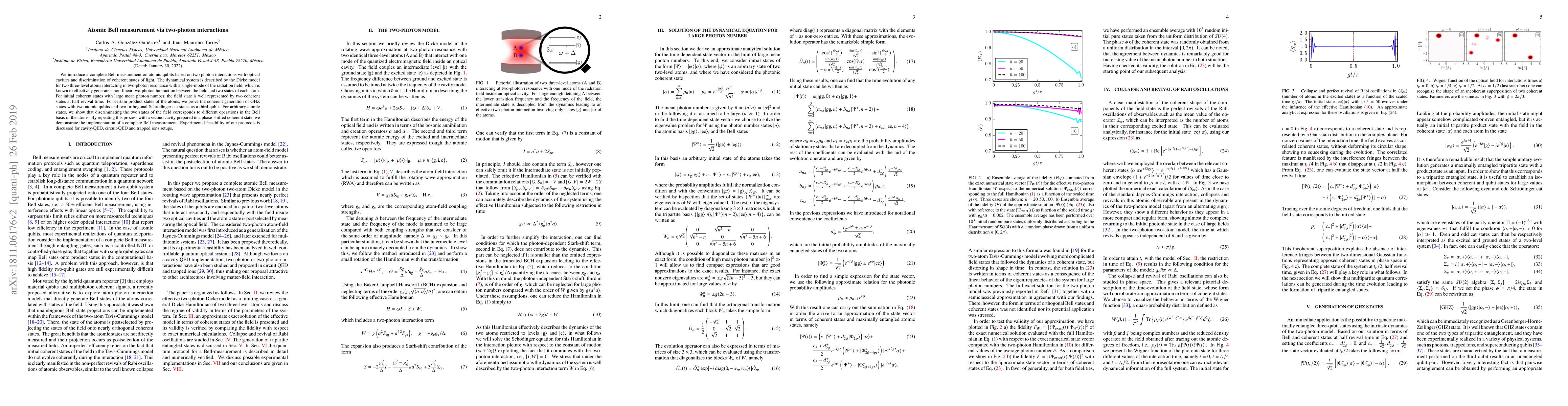 This paper proposes a novel method for performing a complete Bell measurement on atomic qubits using two-photon interactions within optical cavities. The method leverages the Dicke model to generate non-linear interactions and demonstrates the generation of GHZ states and the feasibility of the protocol in various quantum systems.