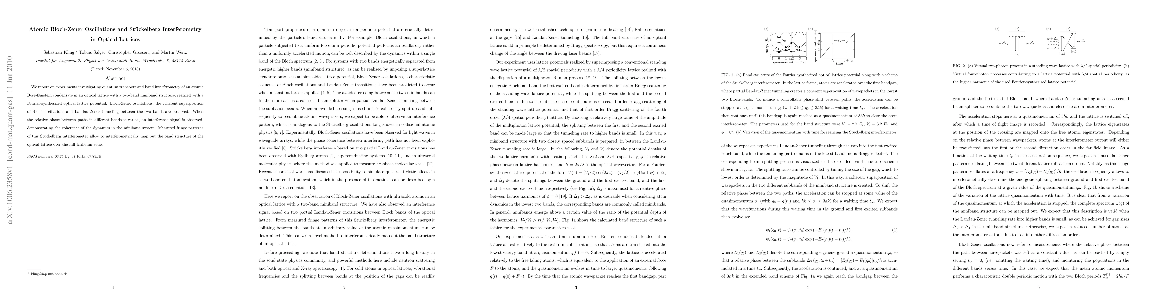This paper reports on experiments observing atomic Bloch-Zener oscillations and St\"uckelberg interferometry in an optical lattice with a two-band miniband structure, demonstrating coherence in quantum transport and mapping out the lattice's band structure via interferometry.