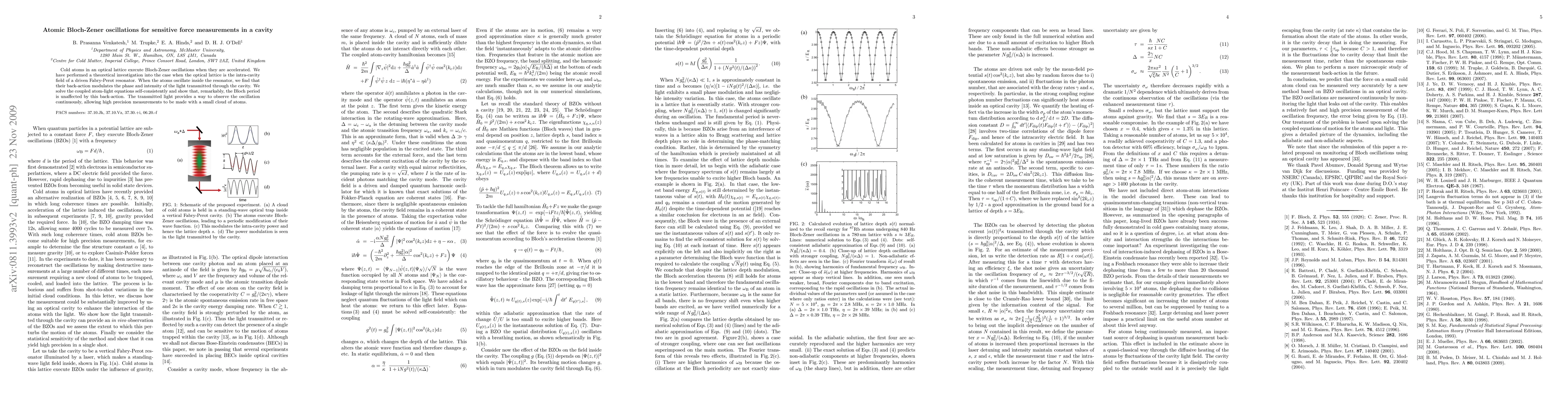 Cold atoms in a cavity execute Bloch-Zener oscillations when accelerated, modulating light phase and intensity with their back-action. This phenomenon enables precise force measurements using continuous observation of the transmitted light.