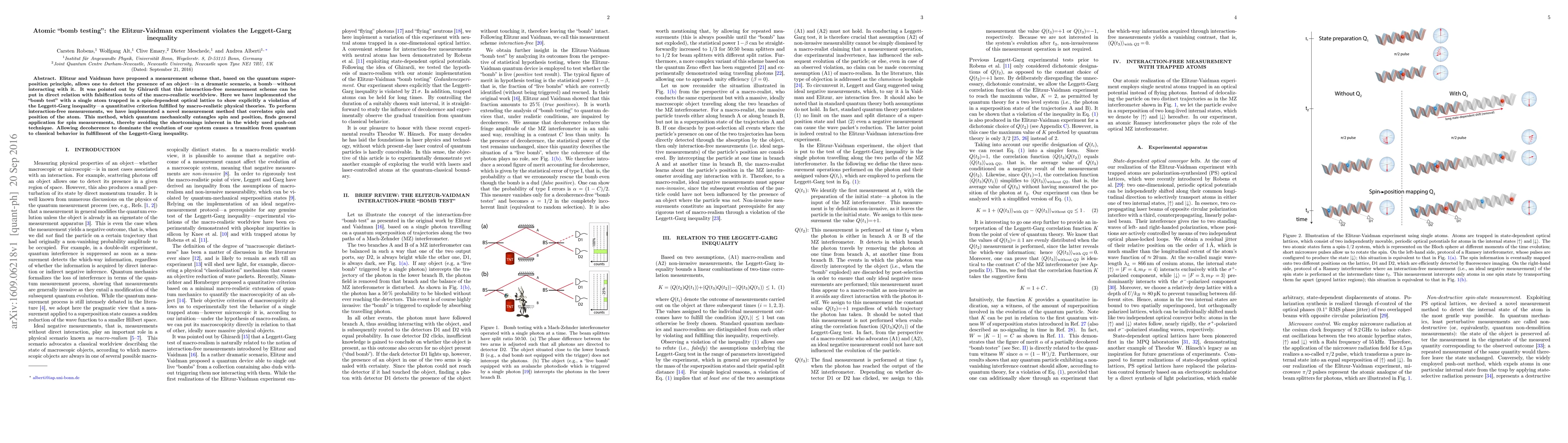 Elitzur and Vaidman have proposed a measurement scheme that, based on the quantum superposition principle, allows one to detect the presence of an object --- in a dramatic scenario, a bomb --- without interacting with it. It was pointed out by Ghirardi that this interaction-free measurement scheme can be put in direct relation with falsification tests of the macro-realistic worldview. Here we have implemented the "bomb test" with a single atom trapped in a spin-dependent optical lattice to show explicitly a violation of the Leggett-Garg inequality --- a quantitative criterion fulfilled by macro-realistic physical theories. To perform interaction-free measurements, we have implemented a novel measurement method that correlates spin and position of the atom. This method, which quantum mechanically entangles spin and position, finds general application for spin measurements, thereby avoiding the shortcomings inherent in the widely used push-out technique. Allowing decoherence to dominate the evolution of our system causes a transition from quantum to classical behavior in fulfillment of the Leggett-Garg inequality.