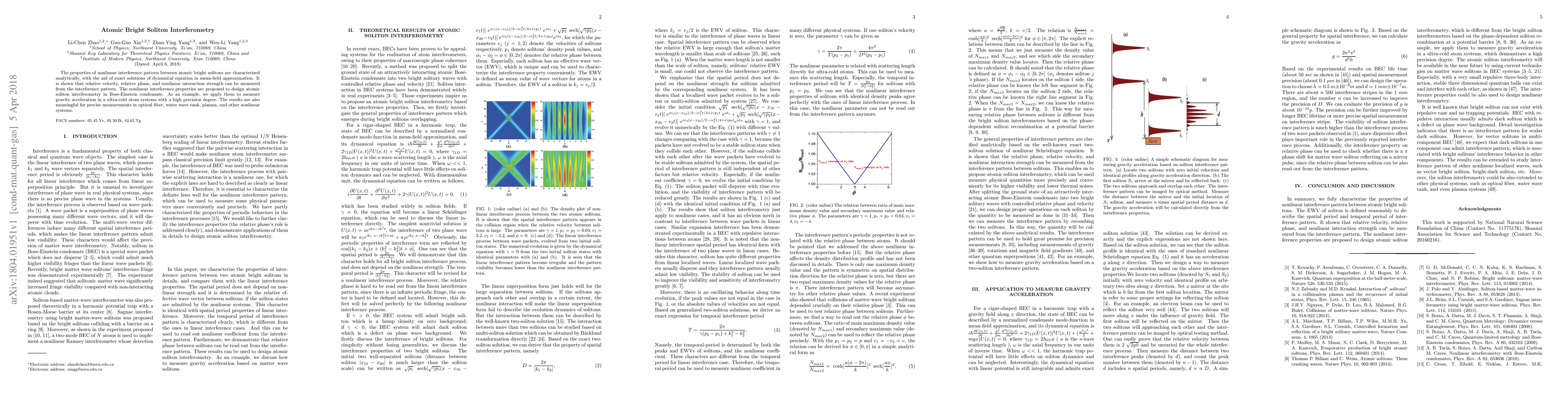 This paper analytically characterizes the nonlinear interference pattern between atomic bright solitons, demonstrating that relative velocity, phase, and interaction strength can be measured from the pattern. It proposes atomic soliton interferometry for high-precision measurements, exemplified by measuring gravity acceleration in ultra-cold atom systems, with broader implications for various nonlinear systems.