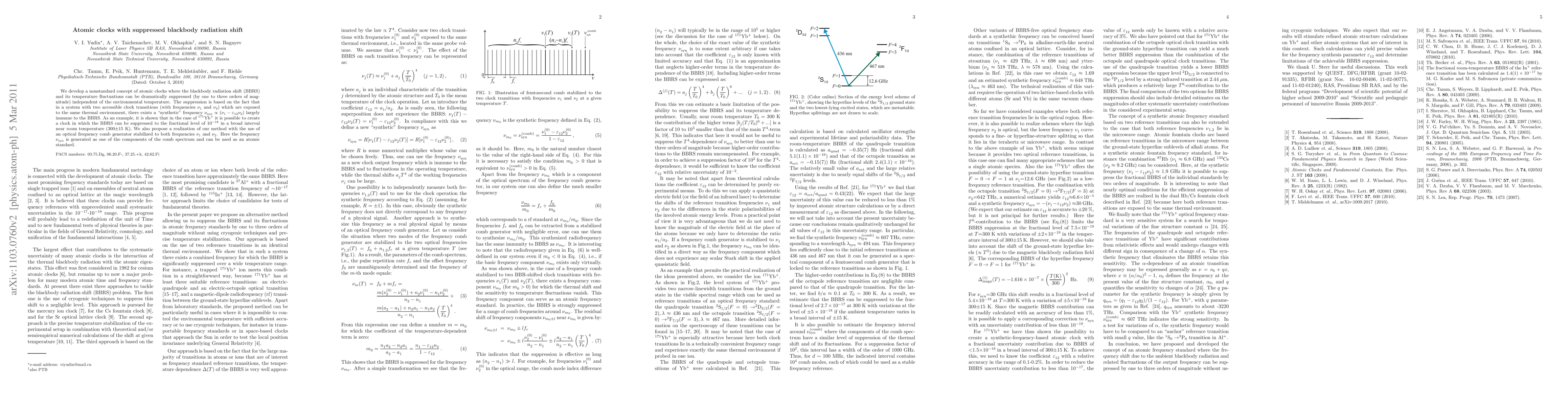 This paper proposes a novel atomic clock design that significantly reduces blackbody radiation shift (BBRS) by creating a "synthetic" frequency immune to BBRS, achieving suppression by one to three orders of magnitude. The method demonstrates a fractional BBRS level of 10^{-18} for 171Yb+ ions near room temperature, and suggests using an optical frequency comb generator for practical implementation.