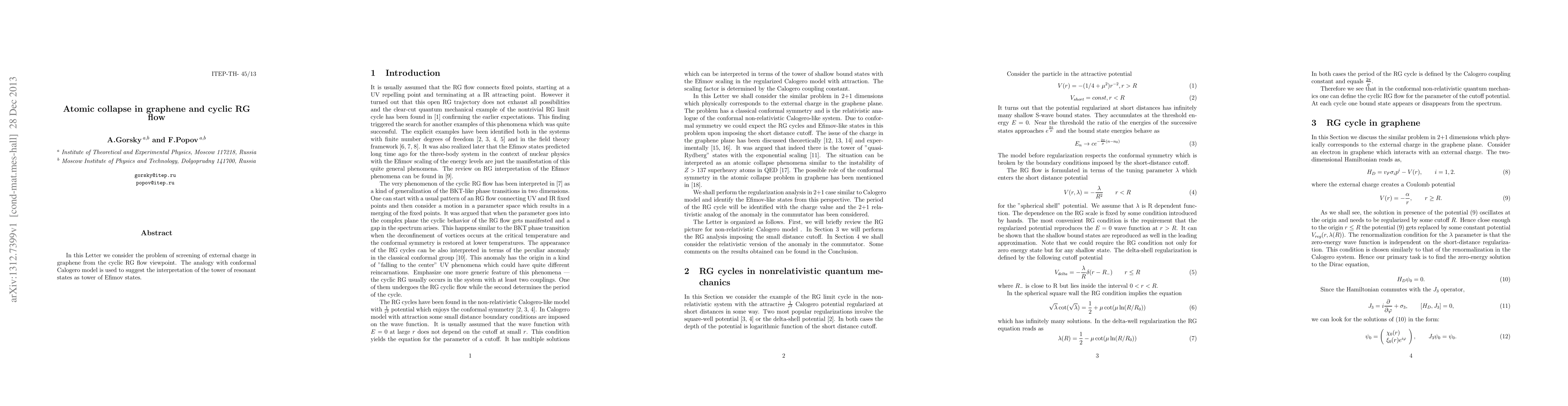 In this Letter we consider the problem of screening of external charge in graphene from the cyclic RG flow viewpoint. The analogy with conformal Calogero model is used to suggest the interpretation of the tower of resonant states as tower of Efimov states.