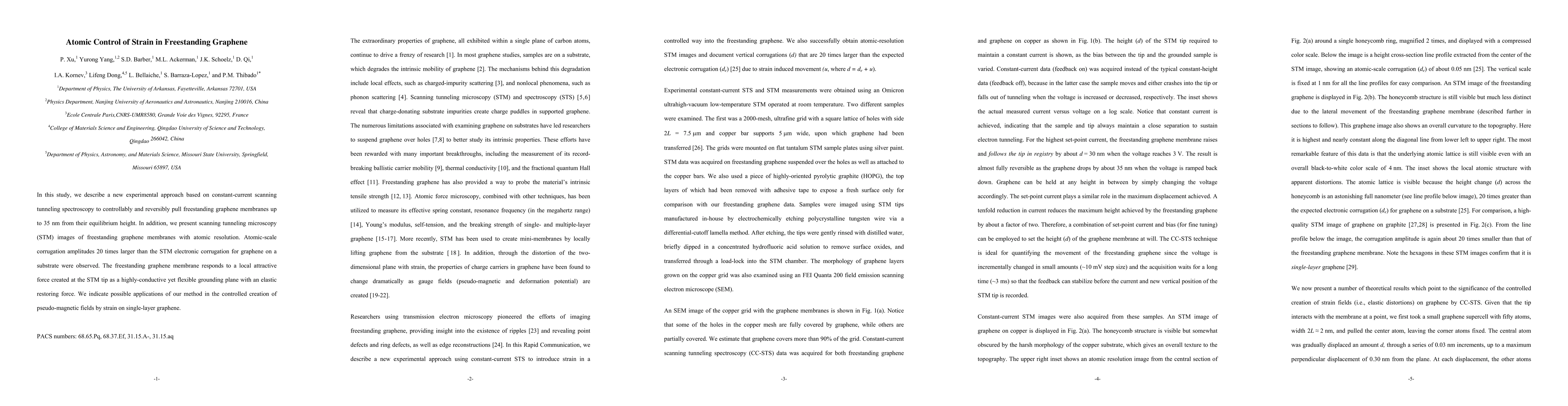 This study introduces an experimental technique using constant-current scanning tunneling spectroscopy to precisely manipulate the height of freestanding graphene membranes, achieving atomic-scale corrugation and reversible strain up to 35 nm. The findings suggest potential applications in creating pseudo-magnetic fields through controlled strain in single-layer graphene.
