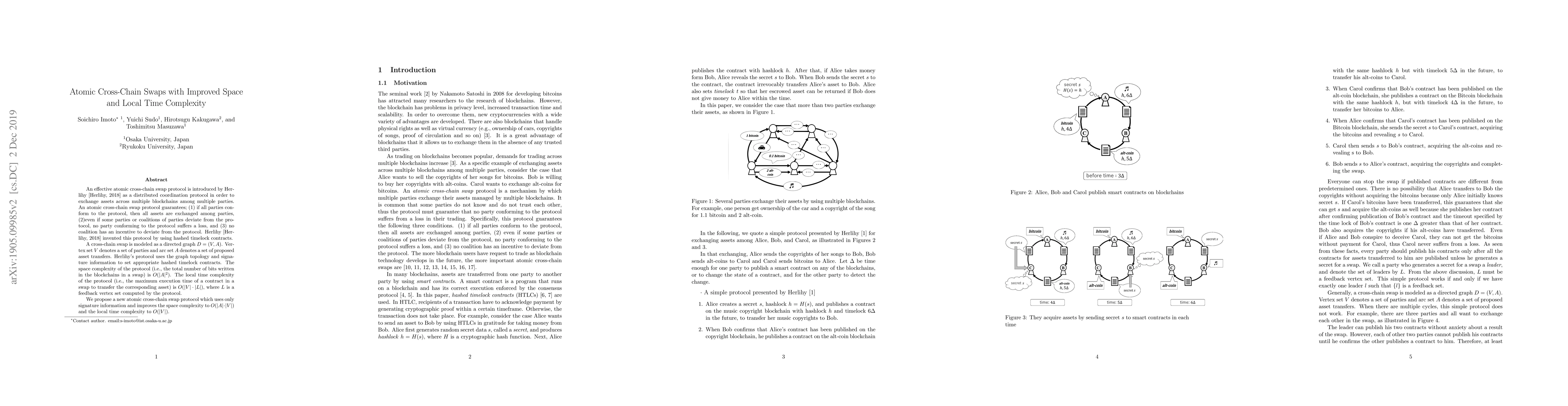 A new atomic cross-chain swap protocol improves space complexity to O(|A||V|) and local time complexity to O(|V|), enhancing security and efficiency in asset exchanges across multiple blockchains.