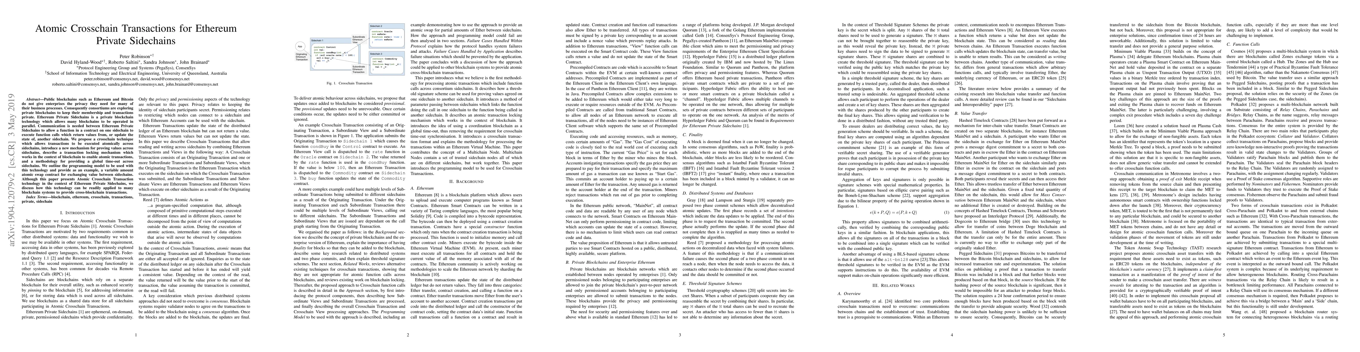 This paper proposes an atomic crosschain transaction technique for Ethereum Private Sidechains, enabling secure and private transactions between parallel blockchains, and outlines a methodology for cross-chain value exchange and transaction timeout mechanisms. The technology can be adapted for use across various blockchain systems.