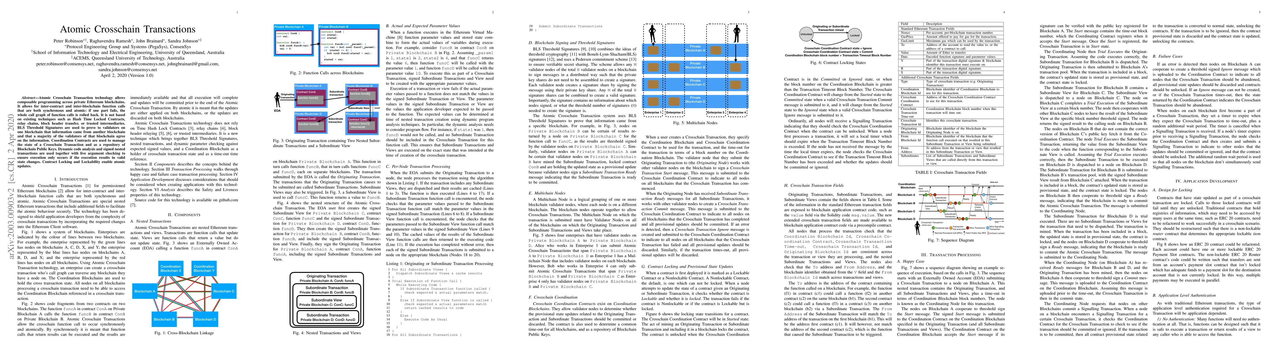 Atomic Crosschain Transaction technology allows composable programming across private Ethereum blockchains. It allows for inter-contract and inter-blockchain function calls that are both synchronous and atomic: if one part fails, the whole call graph of function calls is rolled back. It is not based on existing techniques such as Hash Time Locked Contracts, relay chains, block header transfer, or trusted intermediaries. BLS Threshold Signatures are used to prove to validators on one blockchain that information came from another blockchain and that a majority of the validators of that blockchain agree on the information. Coordination Contracts are used to manage the state of a Crosschain Transaction and as a repository of Blockchain Public Keys. Dynamic code analysis and signed nested transactions are used together with live argument checking to ensure execution only occurs if the execution results in valid state changes. Contract Locking and Lockability enable atomic updates.